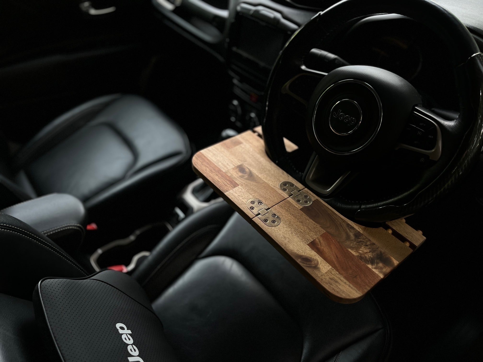 こちらは蝶番(ちょうつがい)のない従来の車載デスクです。樹種をパイン材からアカシア材に変更することで高級感がアップしています。