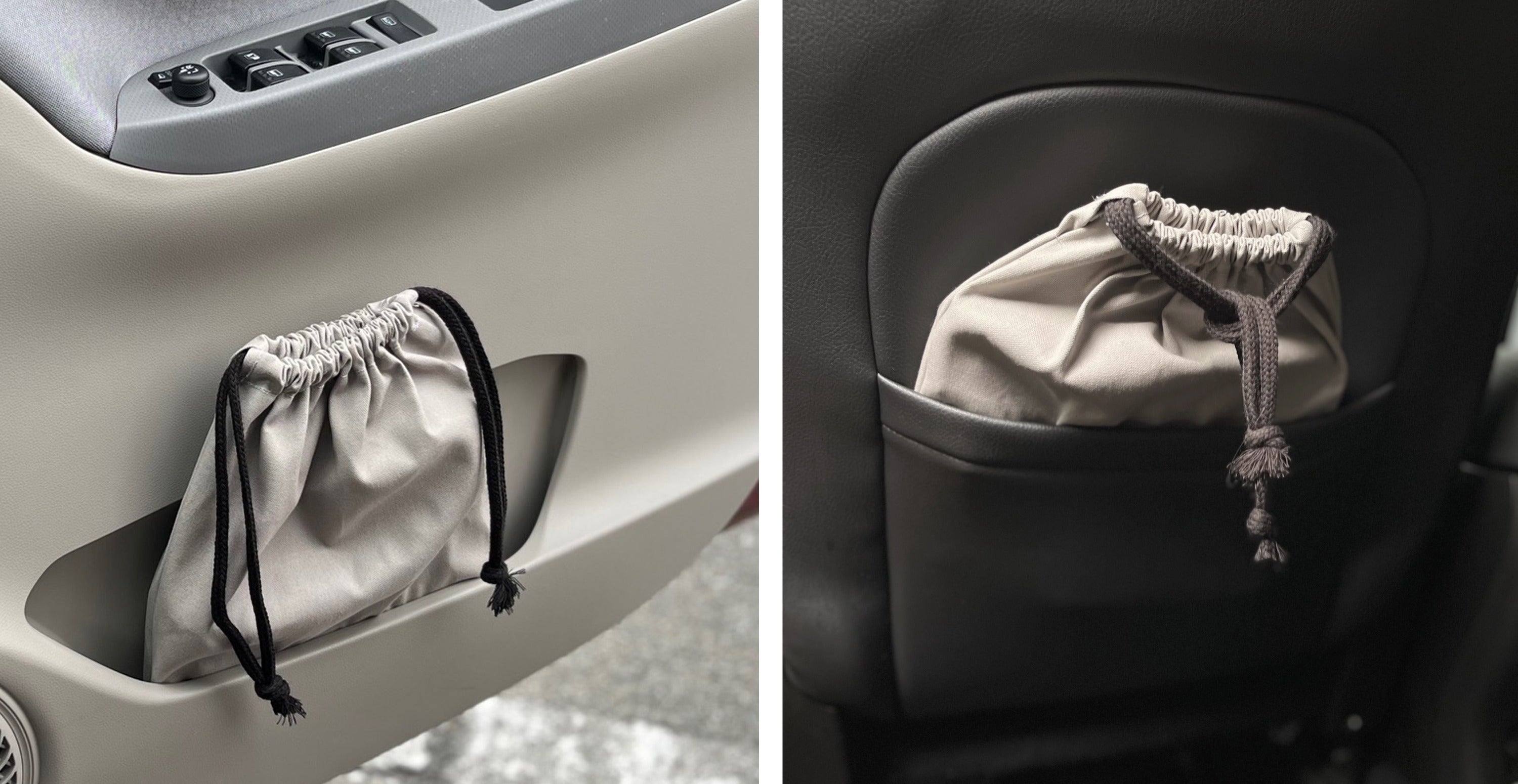 巾着式の開口部は開口が広いデザインで『車載デスク』の出し入れがしやすく、専用設計のゆったりめなデザインとシックなグレージュカラーが、どんな車のインテリアにも馴染みます。また、アウトドア用品やアクセサリー、化粧品入れとしても便利です。