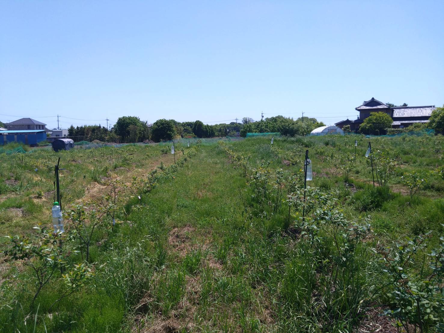 ブルーベリーの間の通路は黒マルチをせず、草(芝やクローバー)を生やし管理しています。そうすることで、微生物が多様化し、土が柔らかくなり、ブルーベリーの根が伸びやすくなります。刈った草をブルーベリーの株元に施用することで、エリコイド菌根菌が増えやすくなります。