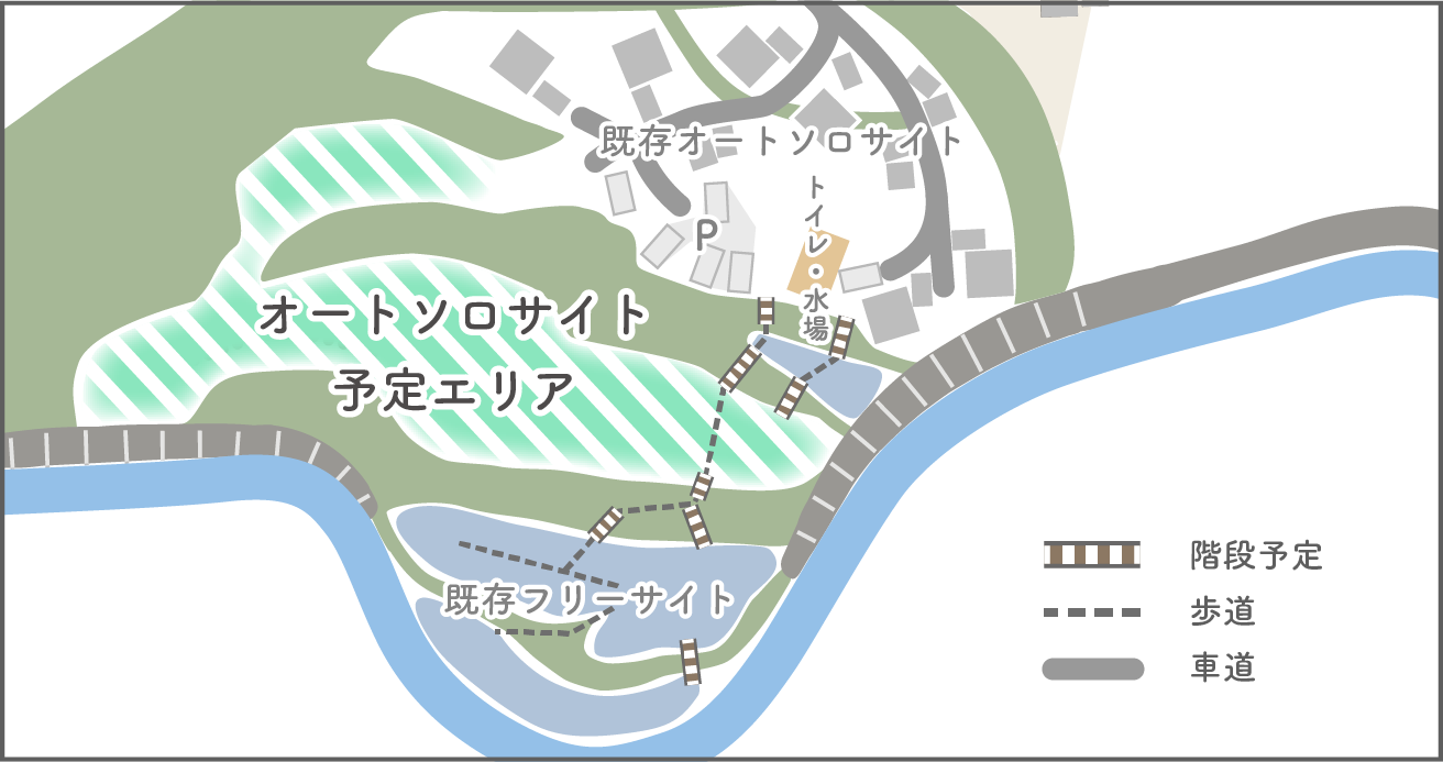 計画としては上の図のように、現在フリーサイトとなっております山林サイトとブッシュクラフトエリアを車が横付けできる「オートソロサイト」に造り直していこうと思います。