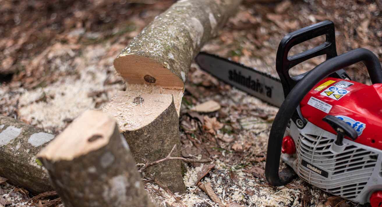 伐採後作業=枝を落とし、幹を割って薪にし、細い木はチップ化する