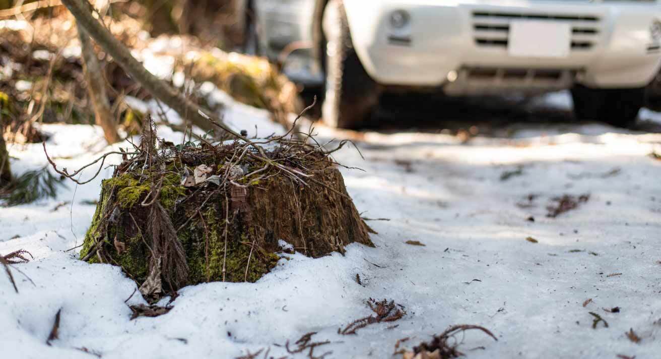 伐採作業=『ソロキャンプの聖地』内の樹木の伐採、危険な根っこの伐根を行う