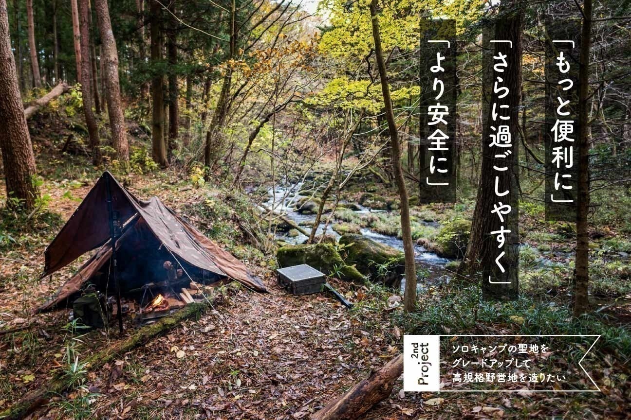 渓流の流れる山林に『ソロキャンプの聖地』を造成して早2年。「渓流と森の大自然」「デュオやグループNGの静寂」に多くの方が癒されてまいりました。今回は…もっと便利に、さらに過ごしやすく、より安全に、をキーワードに第2回目のクラウドファンディングに挑戦いたします!【目指せ!自然と調和した高規格野営地!】