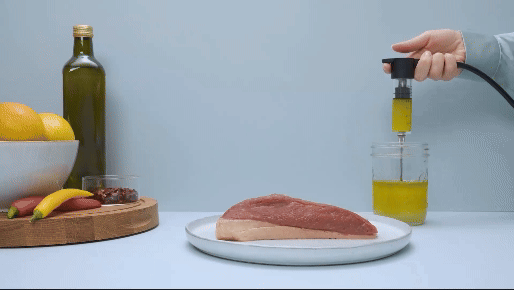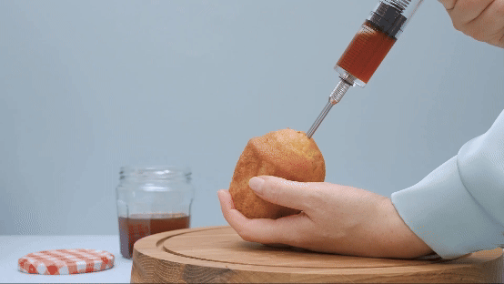 専用のシリンジパーツに作ったソースを入れ、ノズルを食材に差し込むだけで、空気の力を使って中まで直接ソースを注入できます。