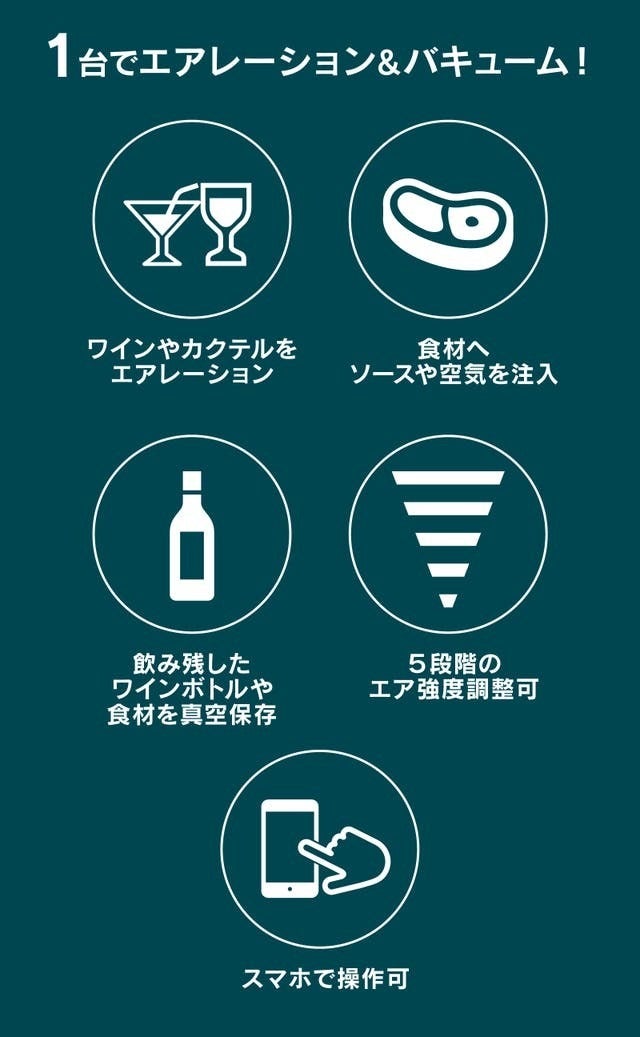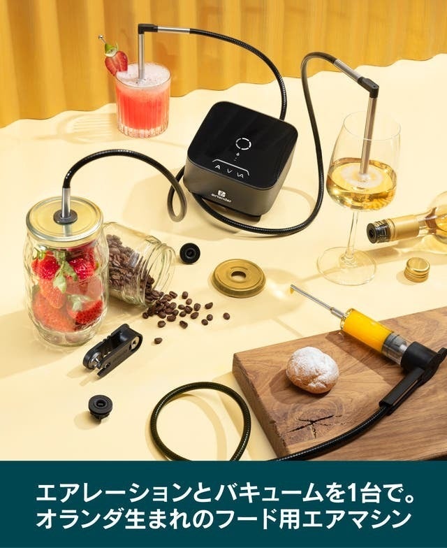 例えばお手元のガラス瓶やワインボトルを真空にしたり、ワインを数秒でエアレーションしたり、即座にカクテルを混ぜたり、泡状のソースやメレンゲを作ったりできるのです。