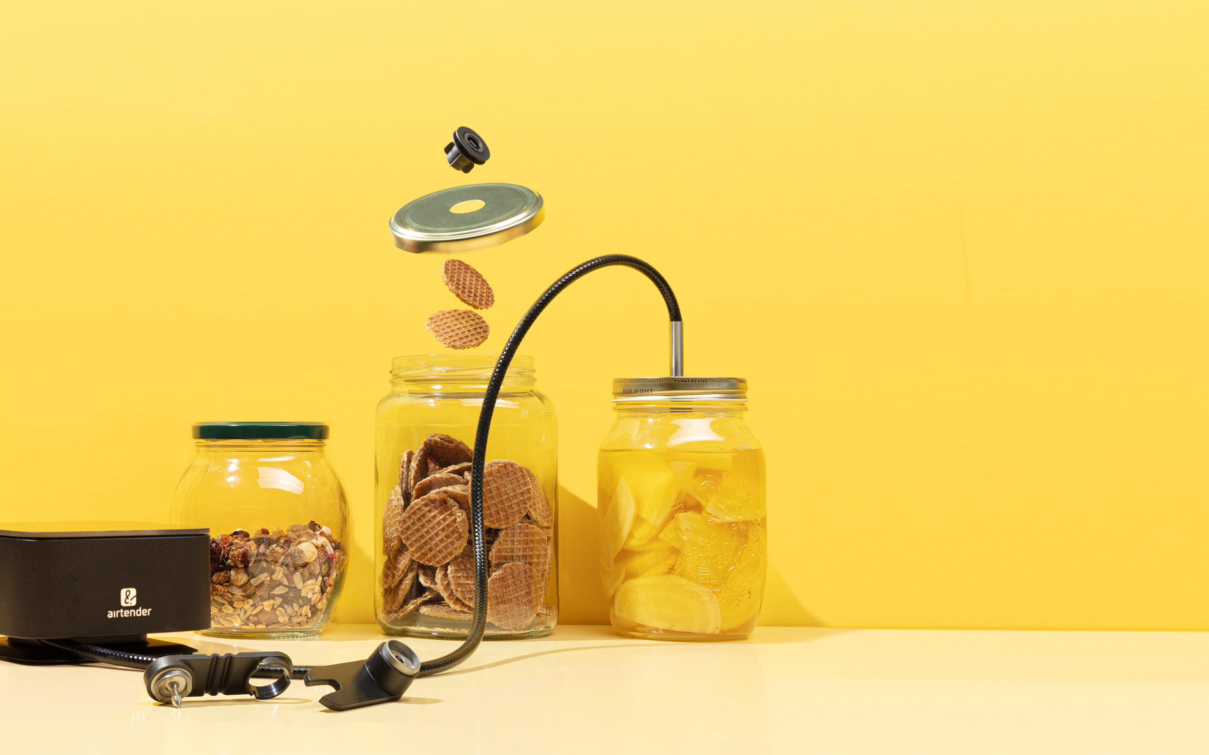 A: 得意分野です。付属のストッパーはボトルに直接装着することが可能です。装着して頂きましたらあとはAirtender Electricのお仕事です。瞬時に真空状態に。お酒も長持ち。食材もお酒も無駄にしません。