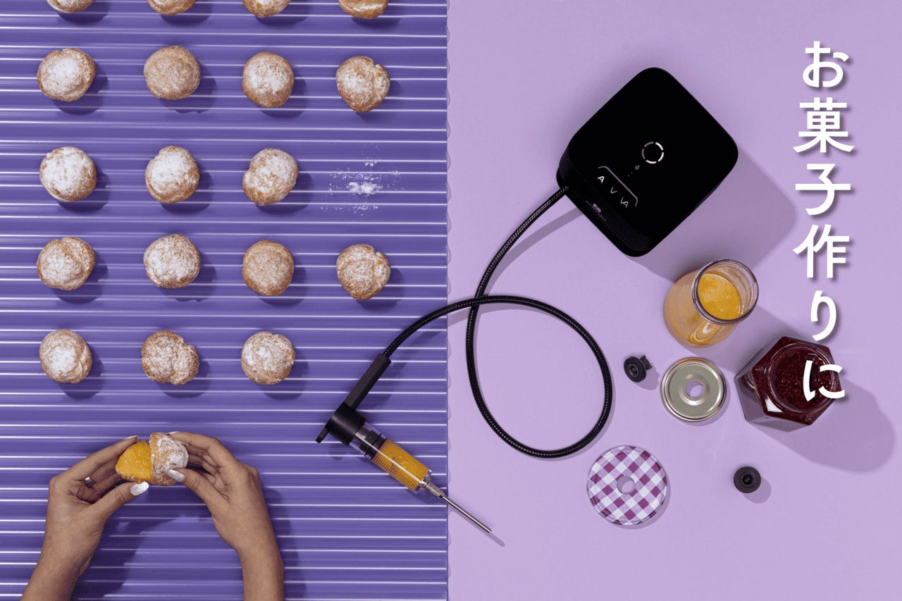 普段お菓子を作る方、お店の方ならでは悩みであるソースの充填も【Airtender Electric】であれば手間要らず。簡単にソースを吸引して注入、注入したらそのまま吸引ができるので次から次にお菓子を作れます!