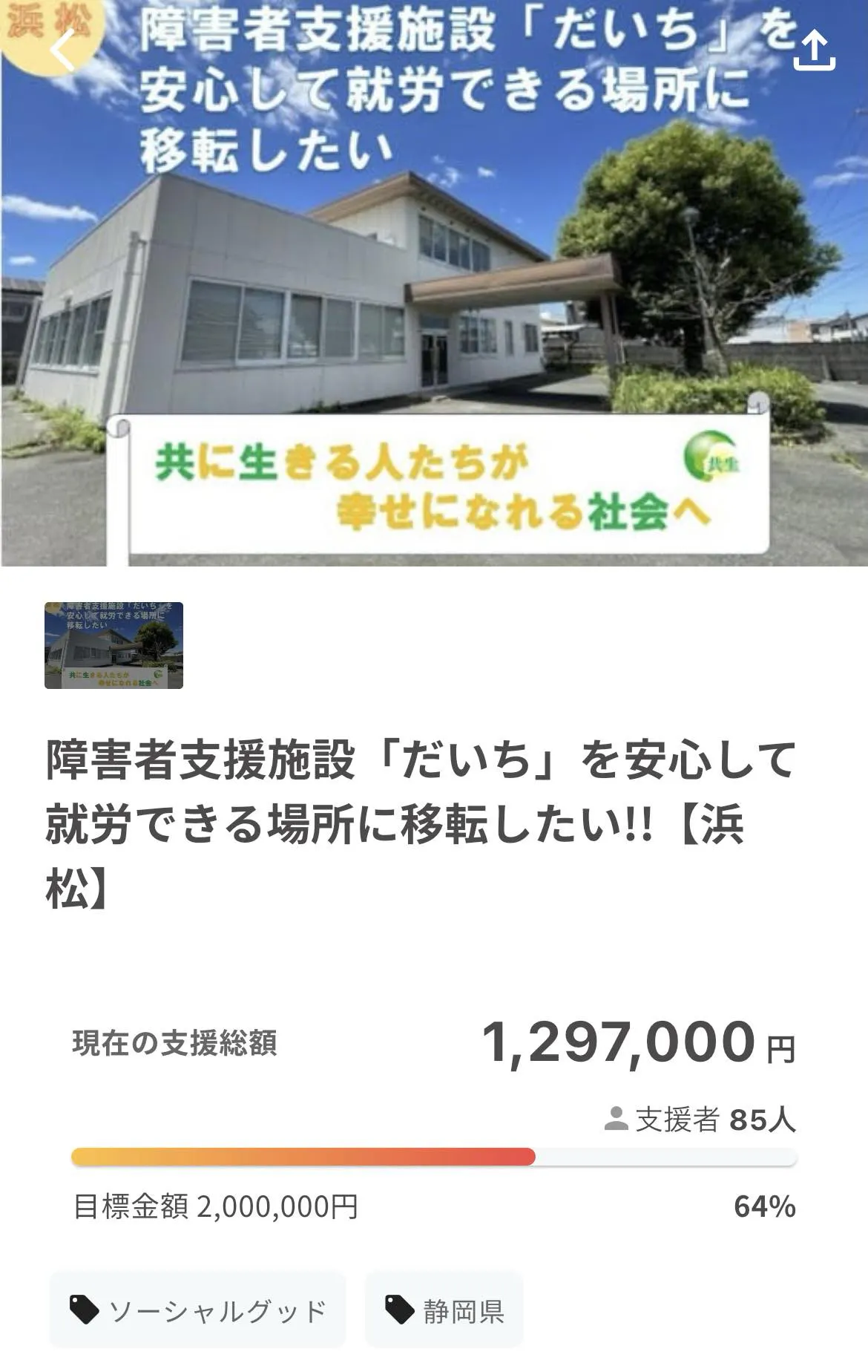 成人施設の移転費用をご支援いただきたく実施した、1回目のクラウドファンディングでは、85名の支援者様から、総額1,297,000円をご支援いただくことができました。