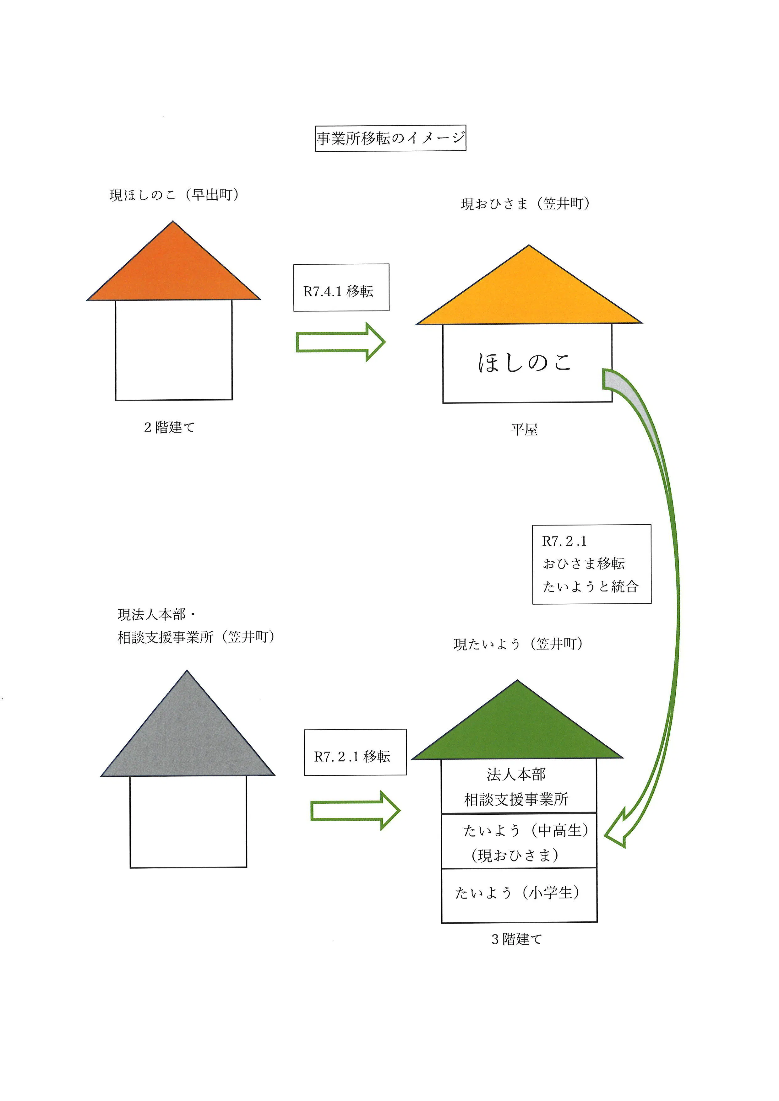 法人内の児童の事業所が笠井に集まることで今までも「ほしのこ(幼児)」から「たいよう(小学生)」「おひさま(中・高校生)」と繋がっている子どももいますが、児童の事業所同士が近くなることで、今まで以上に多くの子どもたちが、ほしのこ4年(最長)に加え小学生から高校生までの12年間の計16年間、長期的な見通しを持って子ども達の成長を見守っていきたいと思っています。