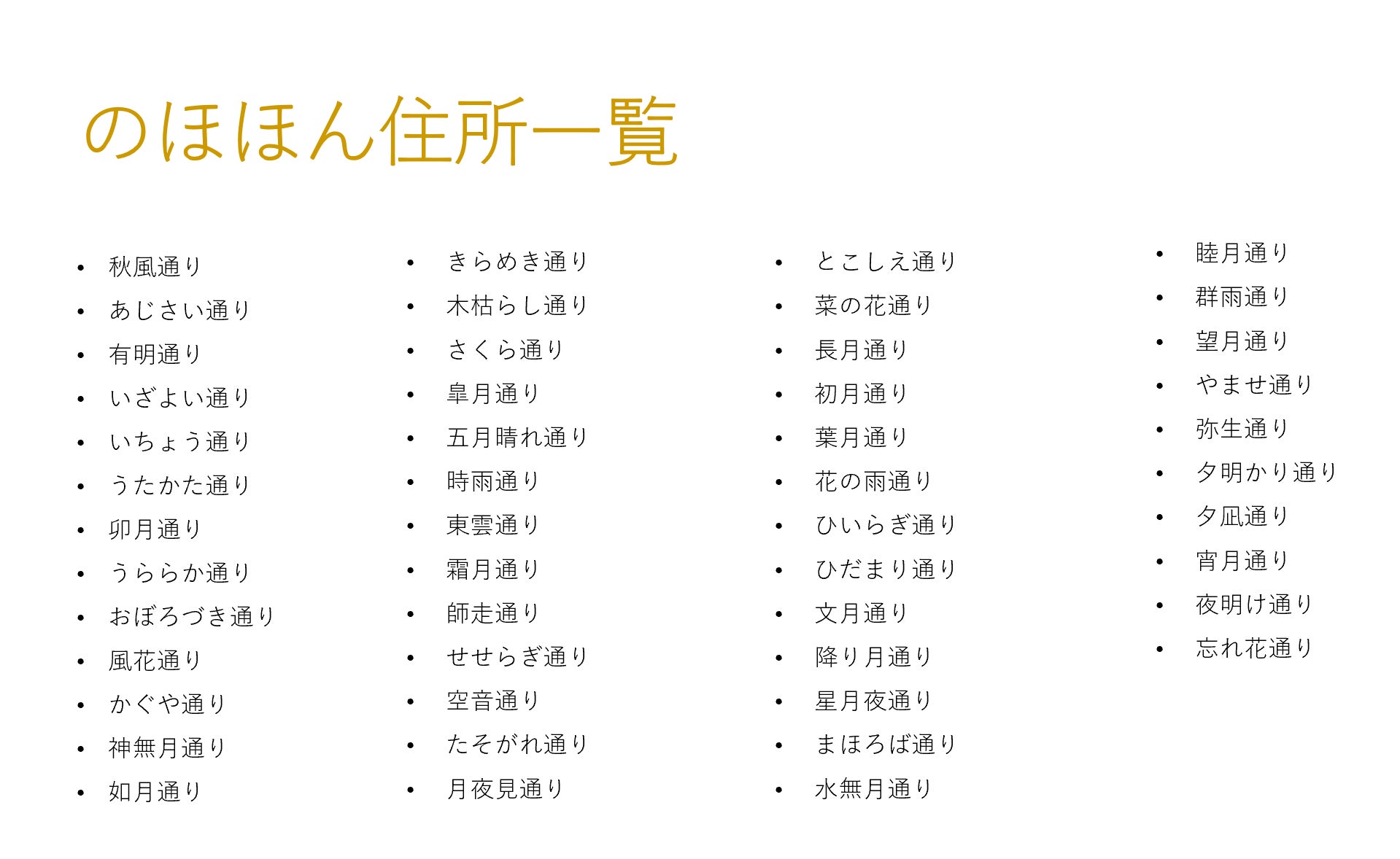 架空の住所詳細は、リターンの「のほほん住所一覧」よりご確認ください。