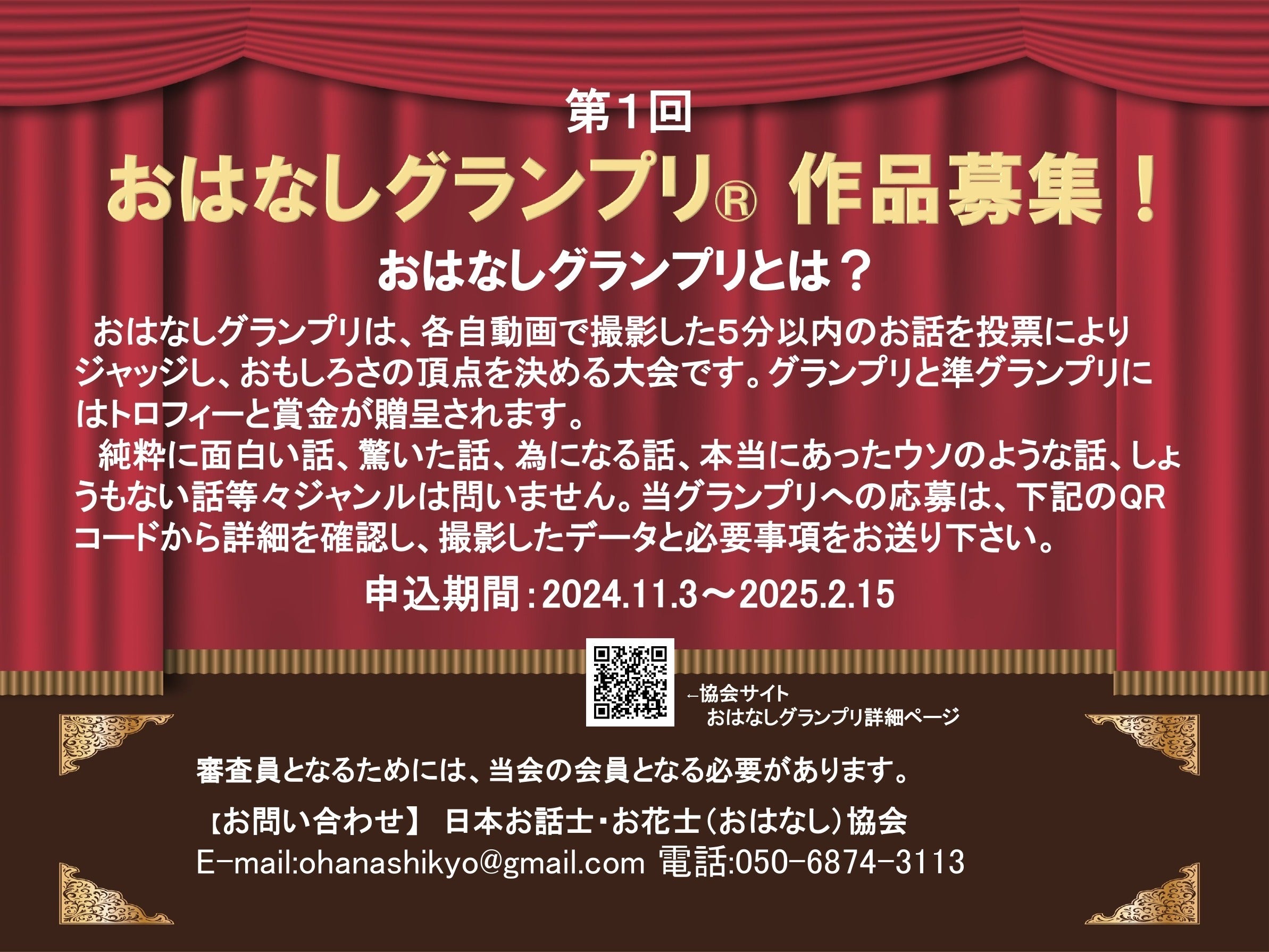 このプロジェクトを通じ、記念すべき第一回のおはなしグランプリを実現するために、宣伝活動、審査会場の設定、スタッフの確保等を行いたいと考えています。本グランプリは、応募希望者本人が、「面白いお話」を各自で撮影した映像を、令和7年3月1日に開かれるグランプリ審査会において審査するものです。「面白い」の基準は様々です。驚いた話、為になる話、本当にあったウソのような話、しょうもない話等々ジャンルは問いません。