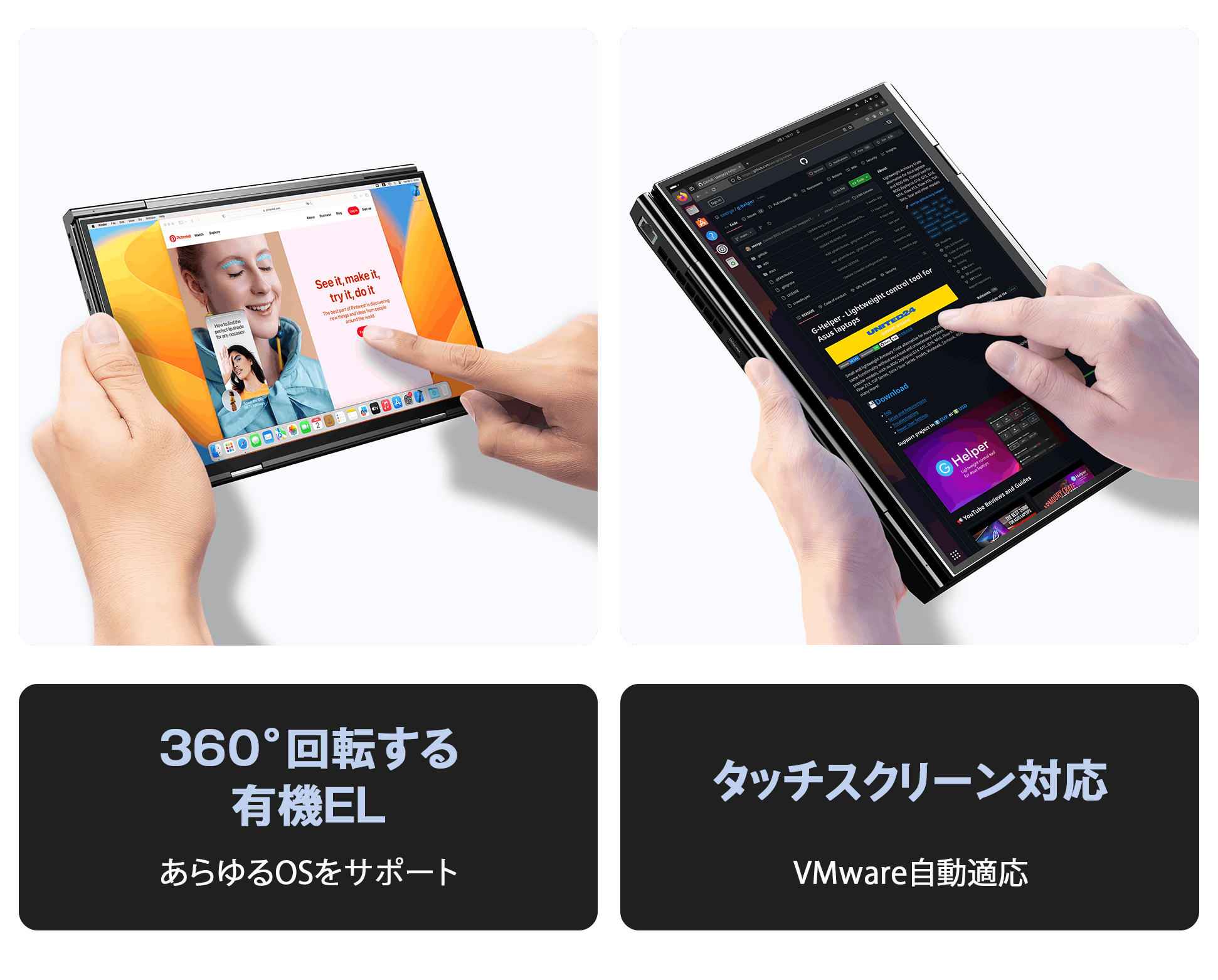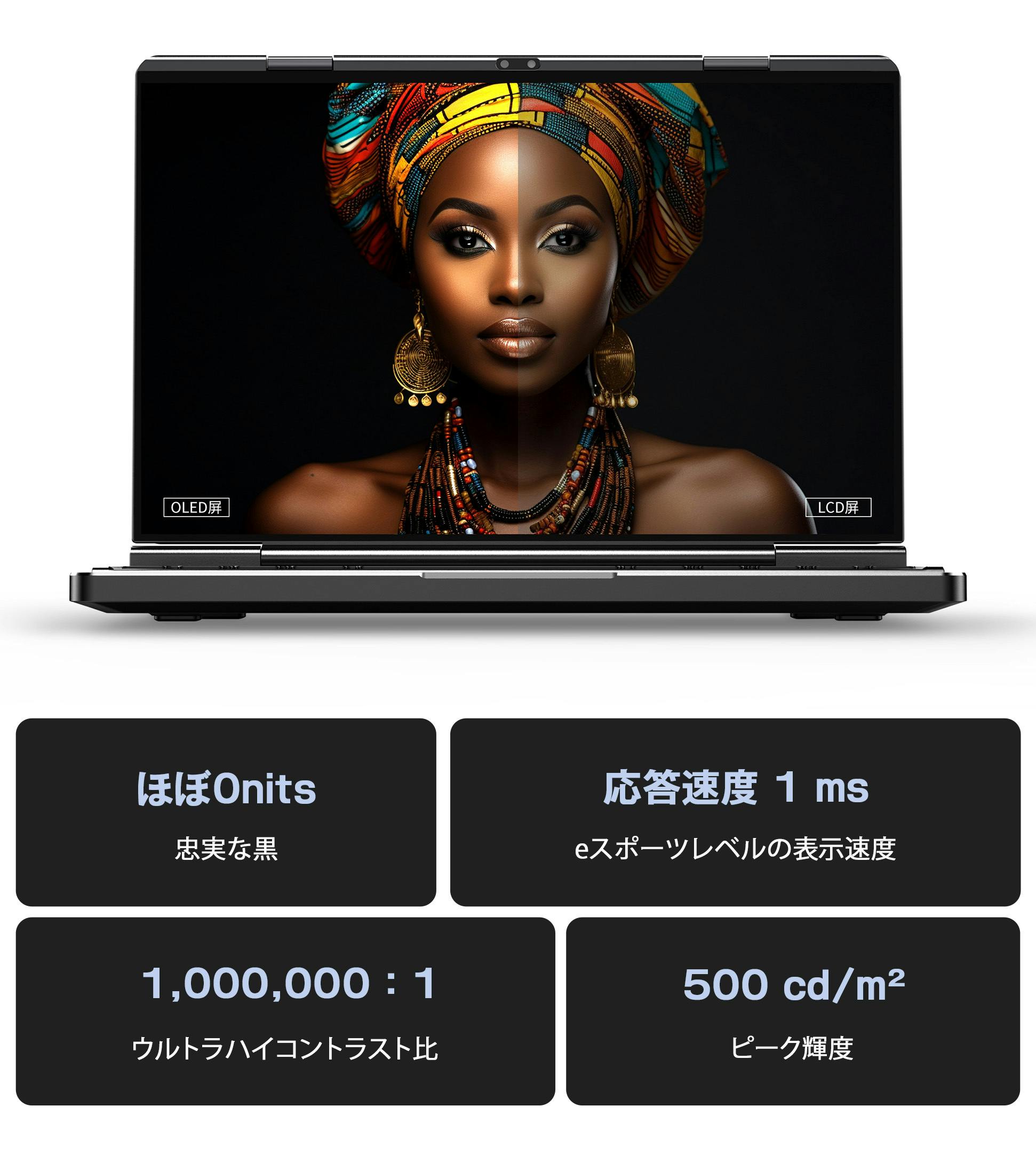 13.3インチモニターはAurora 有機EL フルスクリーンを採用しており、液晶部分が薄く折り畳みを実現いたしました。卓越したカラーパフォーマンスと見事なコントラストで、鮮やかでくっきりとしたディテール、自然な色の変化を備え、デスクワークからクリエイティブワークまであらゆる用途をサポートいたします。