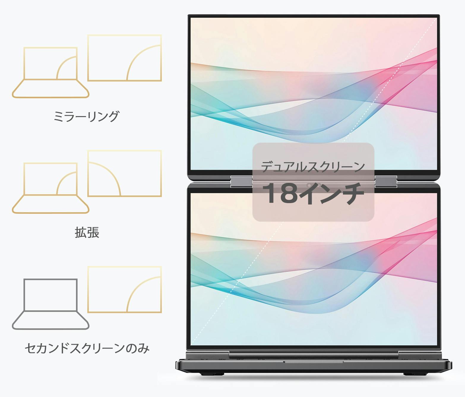 ■スイッチ:セカンドスクリーンがアイドル状態のとき、Fn+F3キーの組み合わせでオフにすることができます。電力をセーブし、シンプルな利便性を提供します。