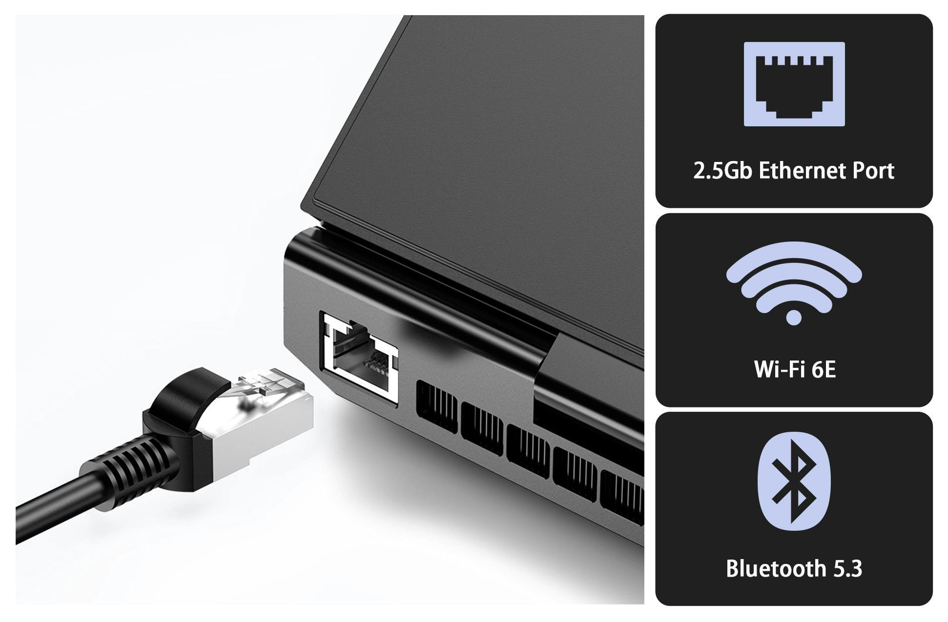 RJ45コネクタ付きの 2.5Gイーサネットポートを内蔵しているため、インターネット接続、ゲーム、ビデオストリーミング、ファイル転送をより高速かつ安定させることができます。Wi-Fi 6Eは、さまざまなネットワーク環境でのシームレスな接続を保証します。Bluetooth 5.3は、最大255台のデバイスとの接続をサポートします!