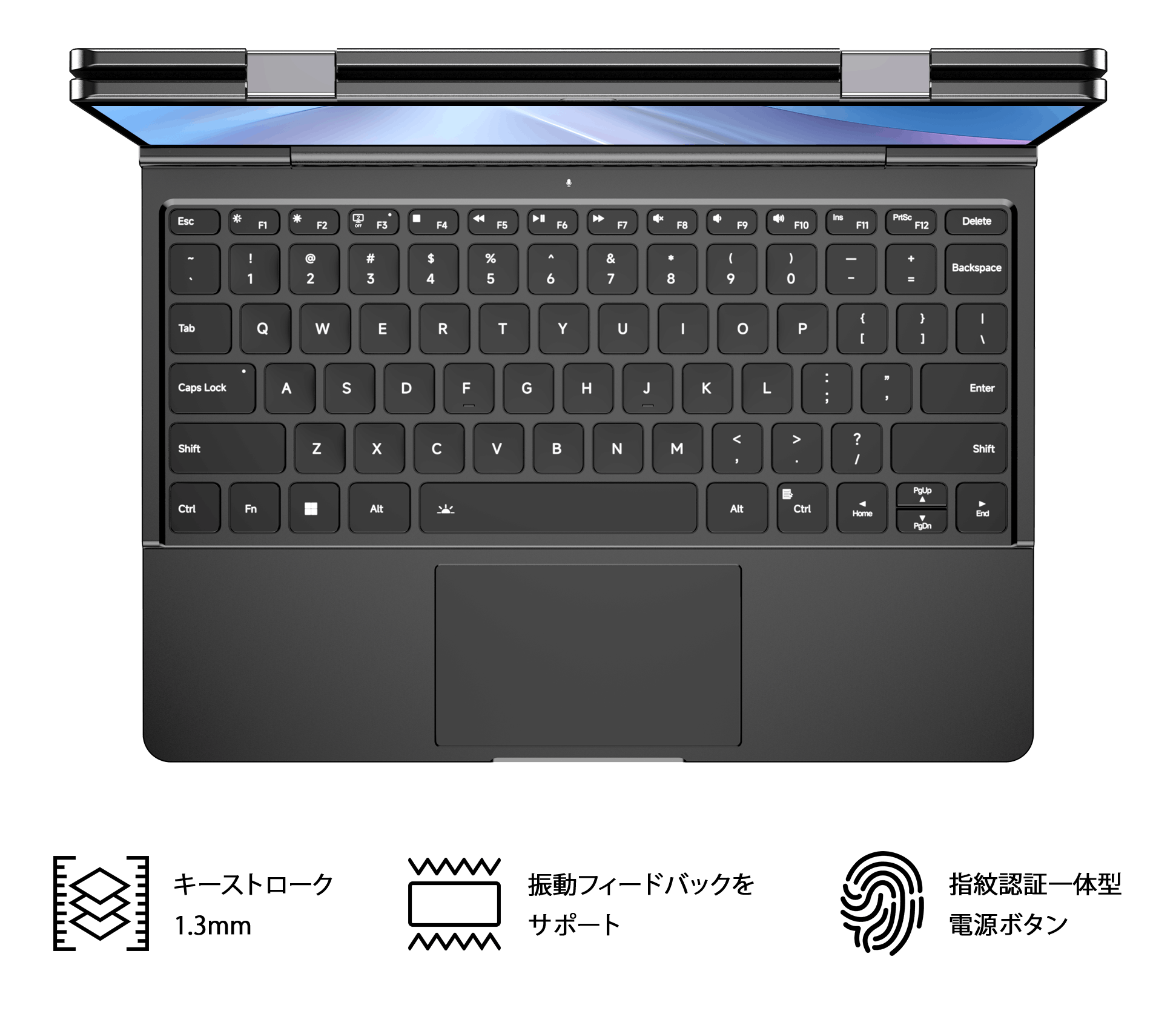 標準のチクレットキーボード、アイランドスタイルのレイアウト、暗い場所での楽な使用のための白いバックライト付きのフルQWERTYキーボードデザイン。精密タッチパッド(PTPモード)は、左右のボタンの振動フィードバックをサポートし、すべての領域で一貫したタッチ感度を確保します。