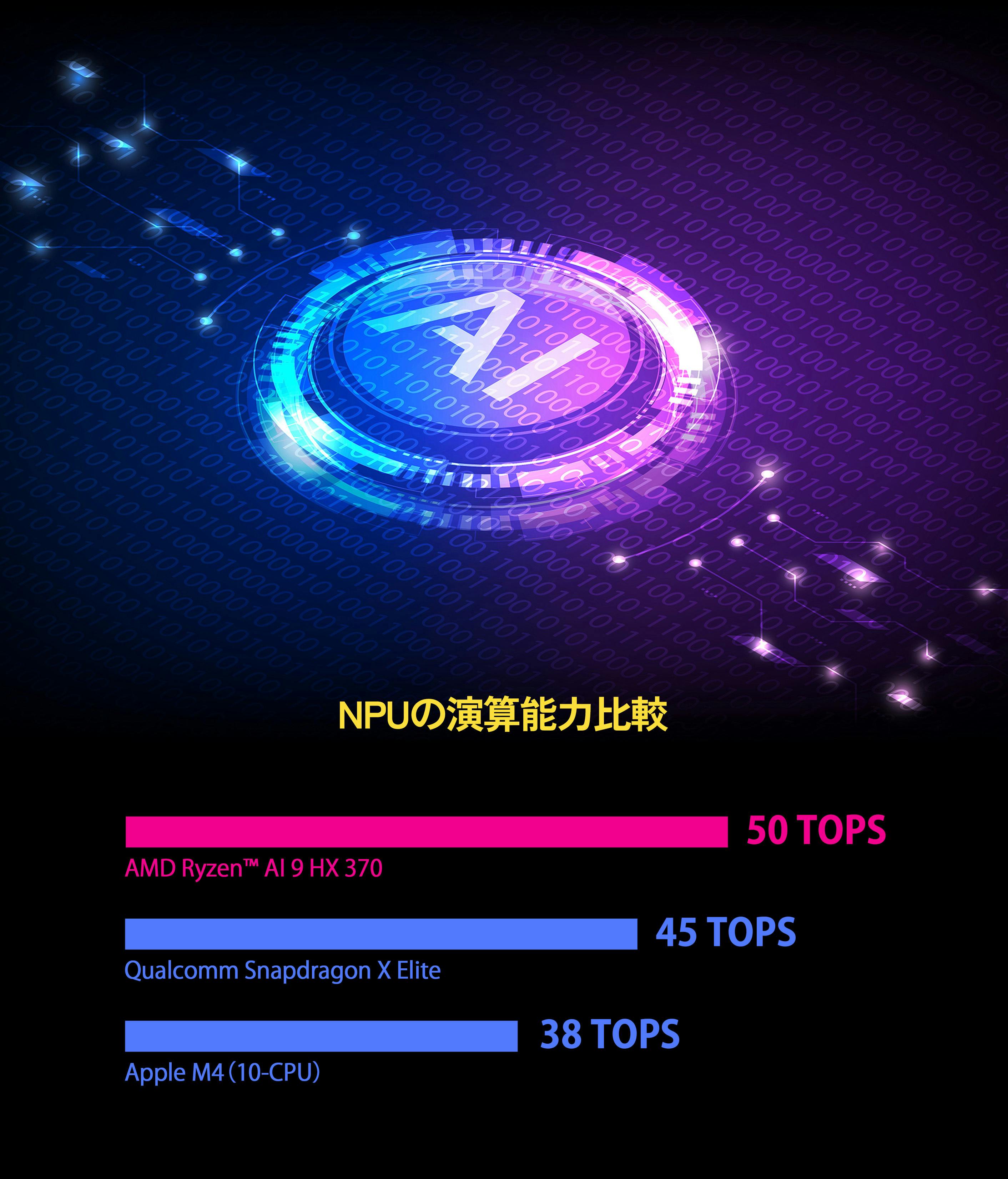 最新NPUのAMD XDNA™ 2アーキテクチャーは、前世代のNPUより3倍のパワーを発揮し、50TOPSに達します。CPU と GPU を合わせると、総計算能力は80TOPSと高く、AI PC の演算能力標準である 40 TOPS をはるかに上回ります。これにより演算効率が向上し、全体的な消費電力が削減されるため、AIマットなどのローカルAI演算タスクがより高速かつ効率的になります。