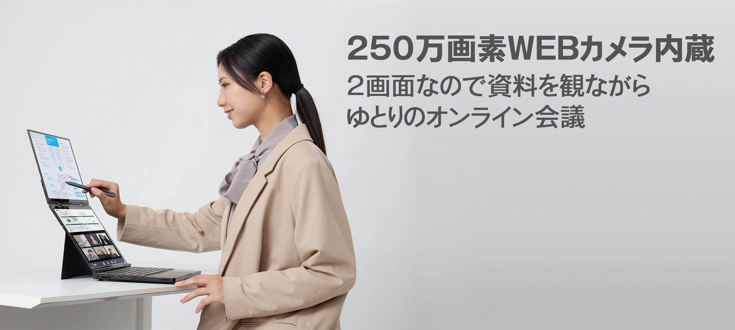搭載しているデュアルディスプレイはどちらとも、タッチパネルになっているので、タッチ操作も可能。さらに4096段階のスタイラスペンにも対応しているので、イラストや会議でメモを取りたいとき、仕事でのプレゼンなど、様々な用途で使用できます。