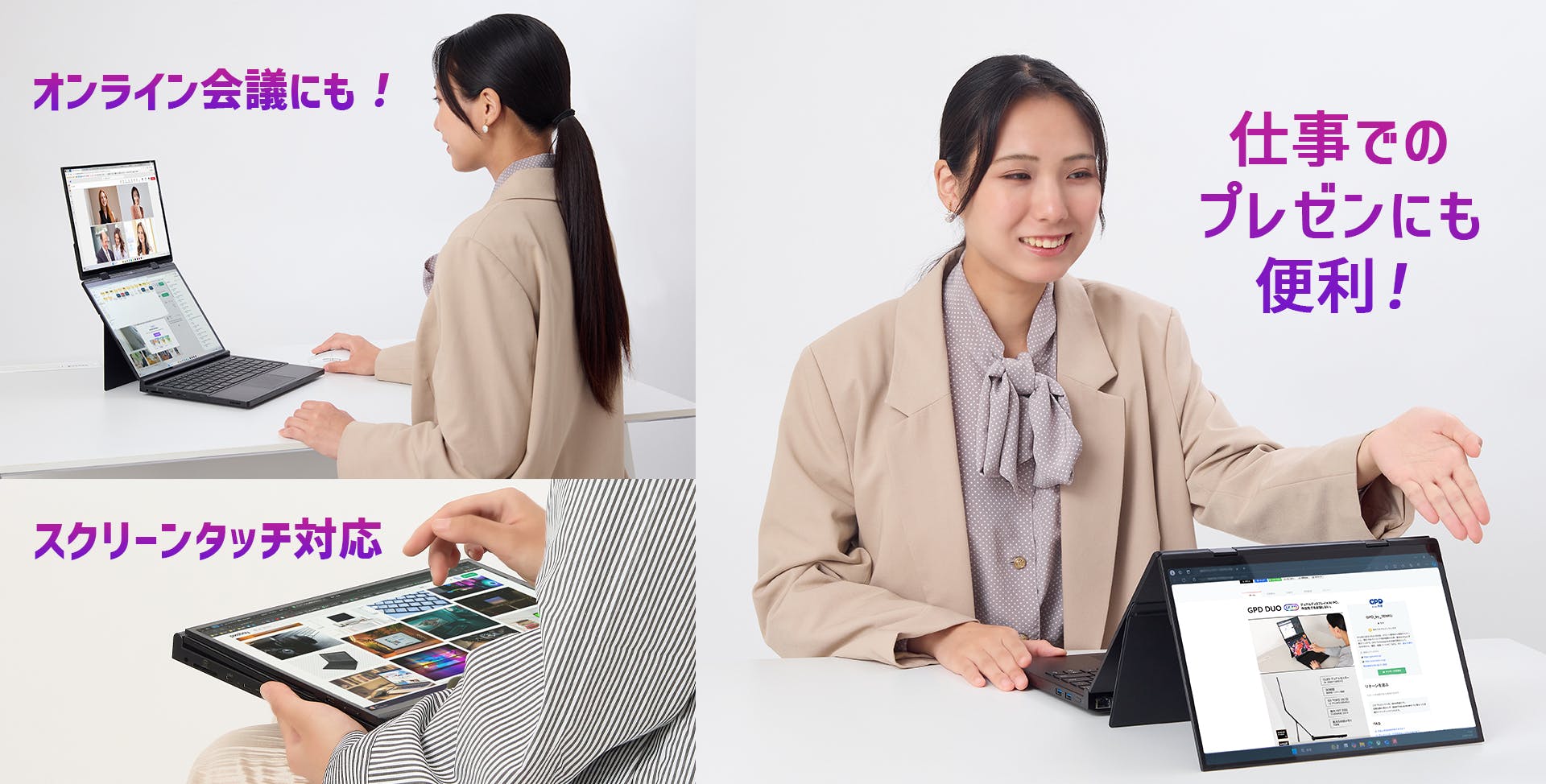 従来のノートPCと変わらない形状で上と下にディスプレイを配置しているので、通常時と変わらず、お使いいただけます。また場所を選ばすにどこでも開くことができるので、出張が多いビジネスマンやカメラマン、クリエイターの方にもお勧めです。