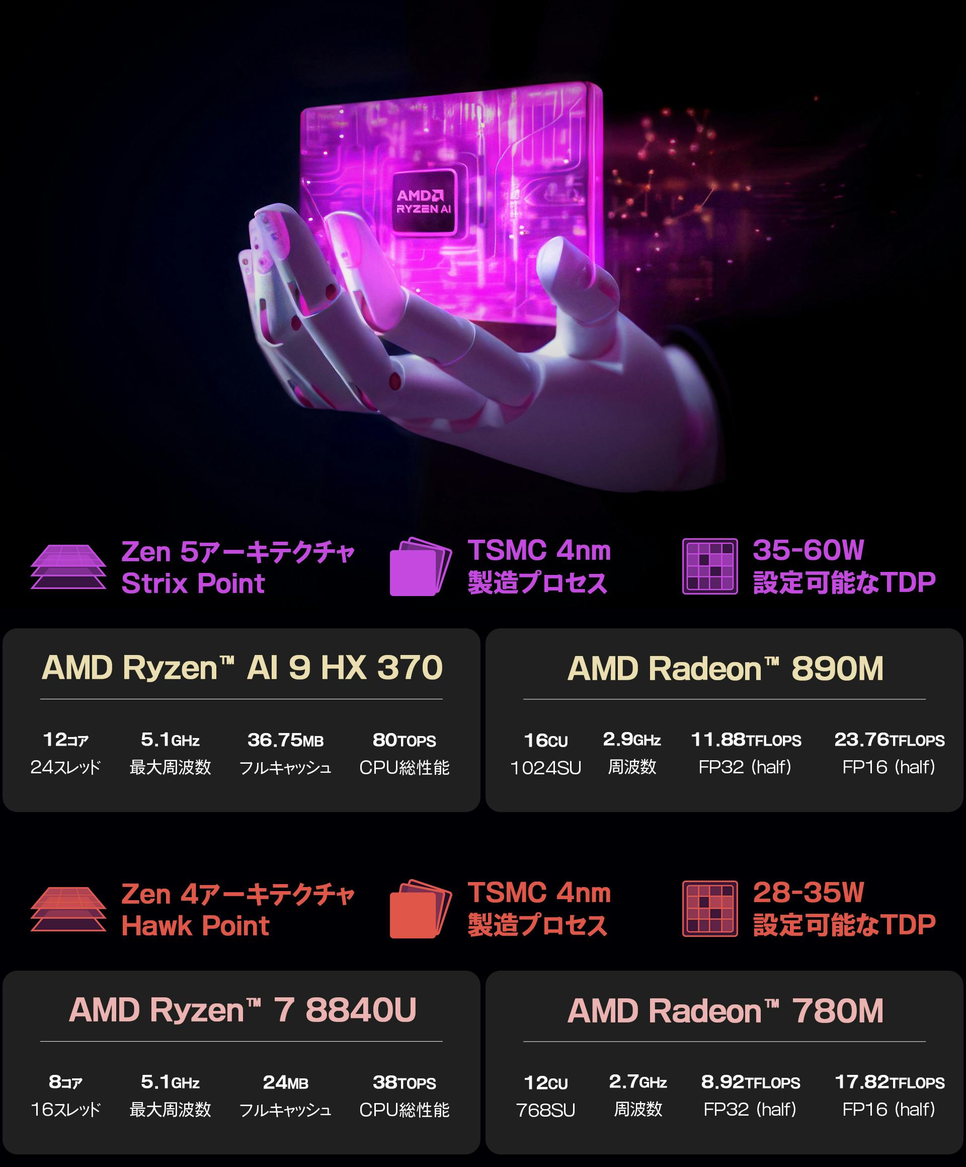 高度な4nmの製造プロセス、ZEN 5 + RDNA 3.5 + XDNA 2アーキテクチャを採用し、最先端の人工知能(AI)テクノロジーを搭載。マルチタスクを実現し、生産性を向上させ、作業効率が大幅にアップします。
