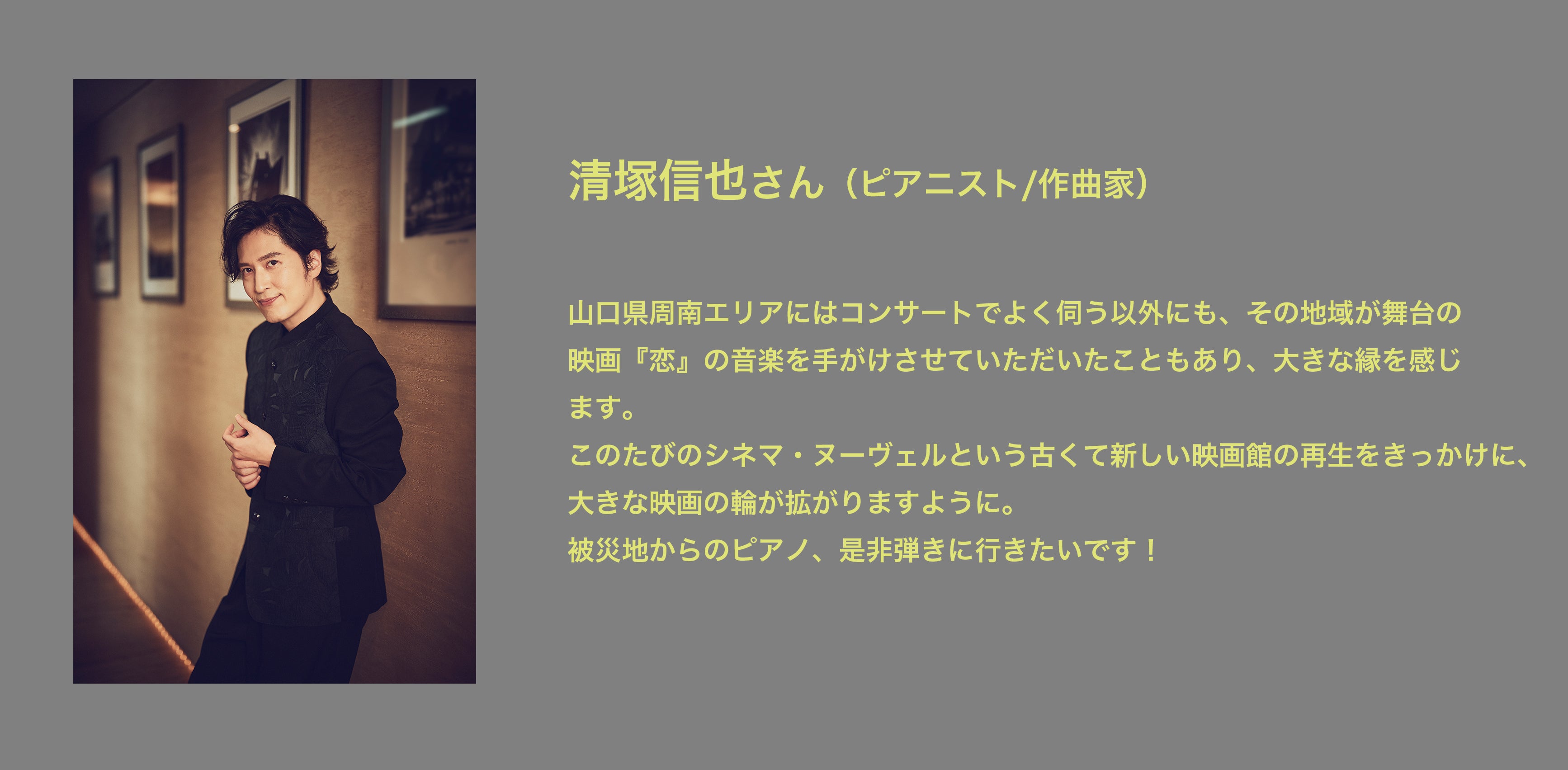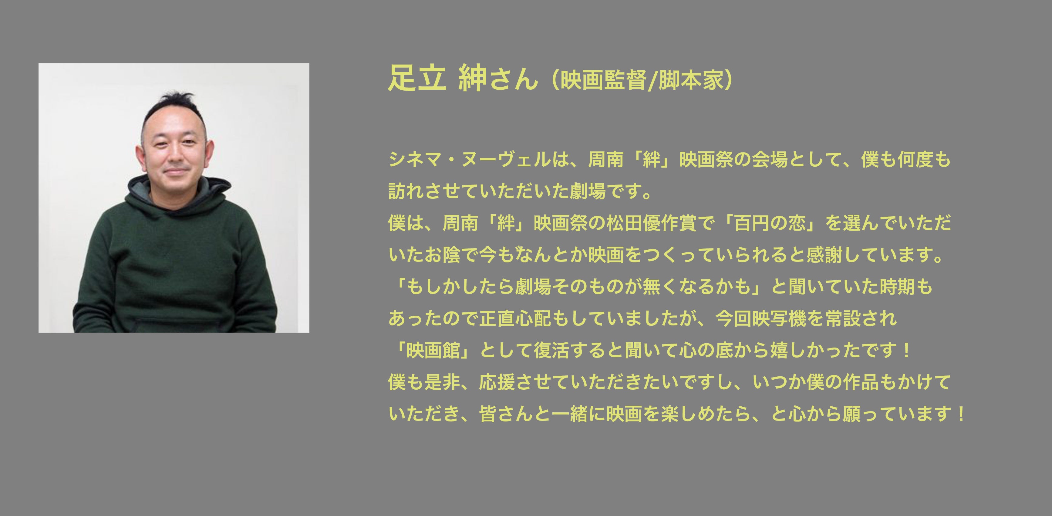 勿論このエリアにはMOVIX周南というとても素敵なシネコンがあり、僕自身も色んな形でお世話になってきました。しかし、長らく、僕も時々関わらせていただいた「周南絆映画祭」のメインスクリーンであるシネマ・ヌーヴェルがついに常設映画館として復活すると聞き、いてもたってもいられなくて、「なんとかしたい、少しでもご恩返しをしたい」という思いでいっぱいになりました。そしてかなり前のめりになってしまい、この映画館で上映したいがためだけに一本の(短編)映画を先んじて製作中でもあります。