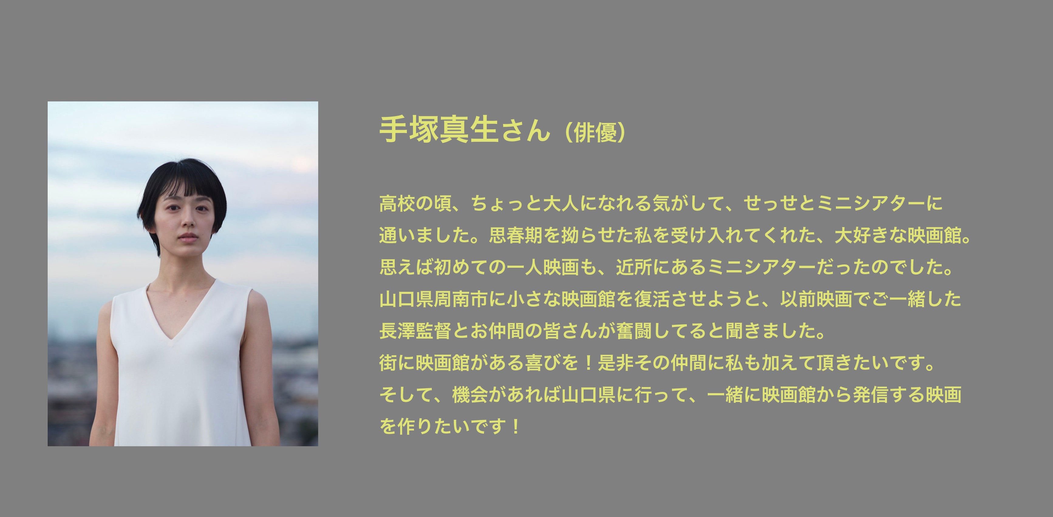 これはすでに発起人のひとりである映画監督の長澤雅彦が、山口県在住の若き女優・望月ちなつさん(ホリプロ所属)を主演に相手役にも山口県内在住の小学生・松田千紘さんを起用。地元のスタッフ・周南公立大学生の有志と共に映画作りを始めています。今後も皆さまのご支援を得たら続々、ワークショップなどを通じて作品を発信していきたいと思っています!