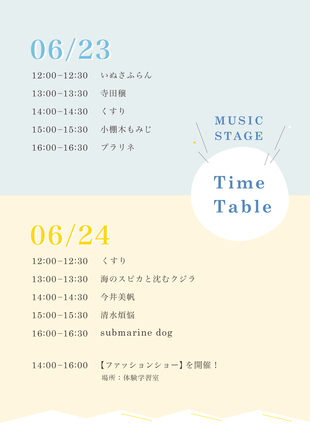 2018/06/14 19:43音楽ステージ、ファッションショーのタイムテーブルが確定しました! 06.23.Sat 12:00-12:30 いぬさふらん13:00-13:30 寺田穣14:00-14:30 くすり15:00-15:30 小棚木もみじ16:00-16:30 プラリネ 06.24.Sun 12:00-12:30 くすり13:00-13:30 海のスピカと沈むクジラ14:00-14:30 今井美帆15:00-15:30 清水煩悩16:00-16:30 submarine dog 14:00-16:00 ファッションショー at体験学習室 音楽ステージは、STORE IN FACTORYの皆さんが、この時しか見れない特設ステージを製作します。テーマは団欒、お楽しみに。 イベント当日まで、あと9日となりました。自分たちのやれることをすべてやって、当日を迎えられるように頑張ります。引き続き、よろしくお願いします。 もっと見る