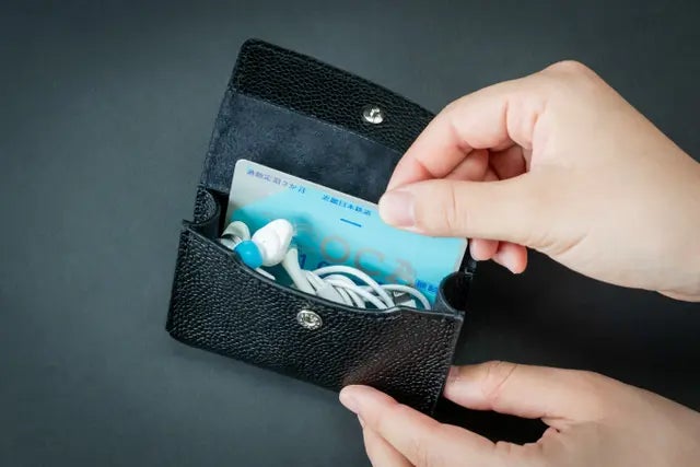 【イヤホンの収納】外付けポーチを追加することで、イヤホンといった細かい小物を収納して持ち運びやすくなります。交通系ICカードも収納できる大きさになっているので、カードを出さずに改札を通ることができます。