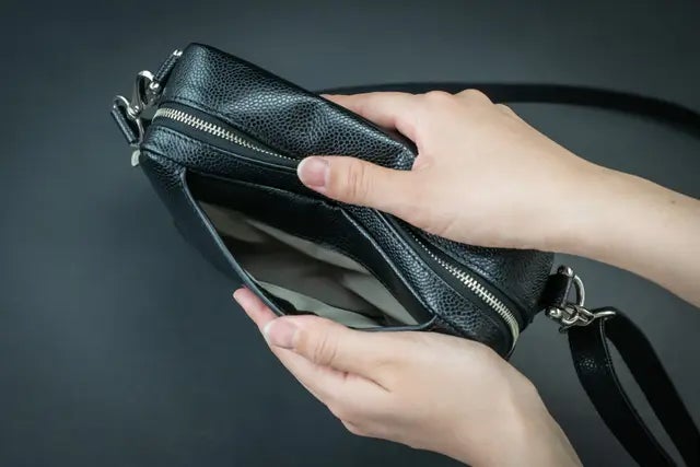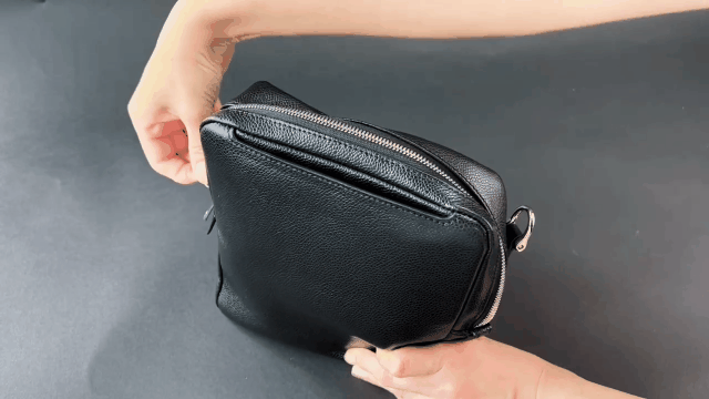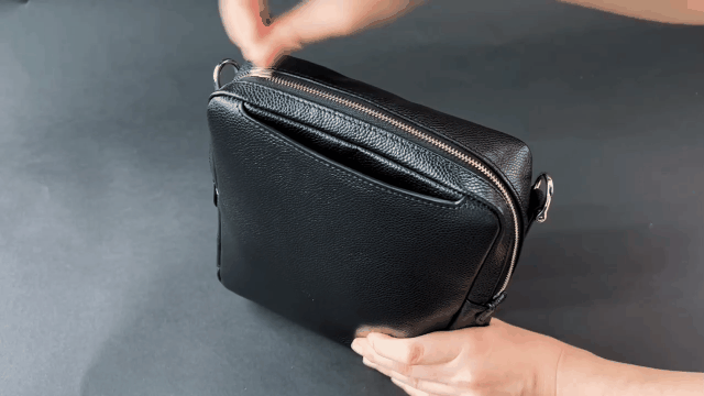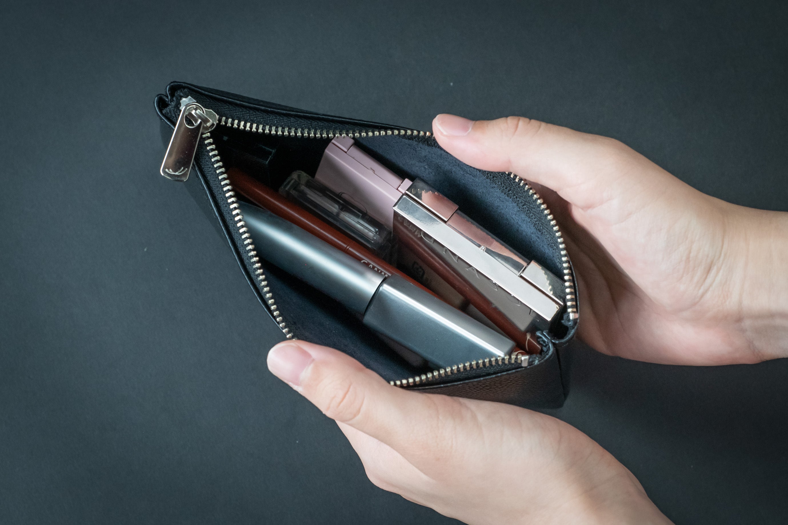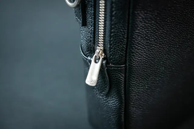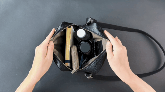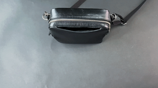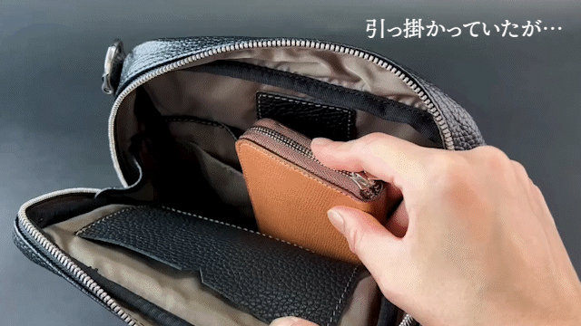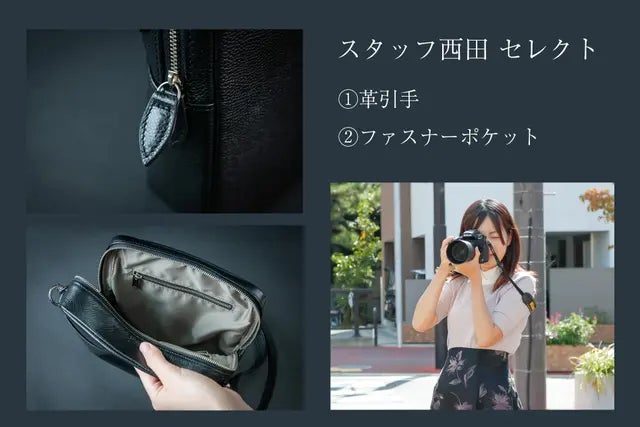 こんにちは!カメラマンの愛です。私は心配症な性格で「大切なものがなくならないか」不安なので、ファスナーポケットが必要と思いました。また焦りたくないので引手を大きくして、スッとつかんで、パッと開けるように革引手を選びました!