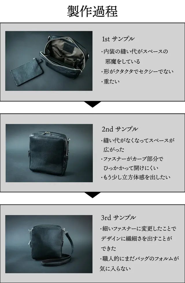 初めまして、新進工房の職人の仙入雅之と申します。今回も新進工房のスタッフみんなの知恵を寄せ集めて、ようやく完成することができた「大人クロスボディバッグ」です。ただ単にかっこいいだけでは、今のご時世「そうは問屋が卸しません」。若手職人たちの小さなアイデアの種を、先輩職人たちが「便益」という名の水をやり、みんなで完成させる姿は涙ぐましいものがありました。