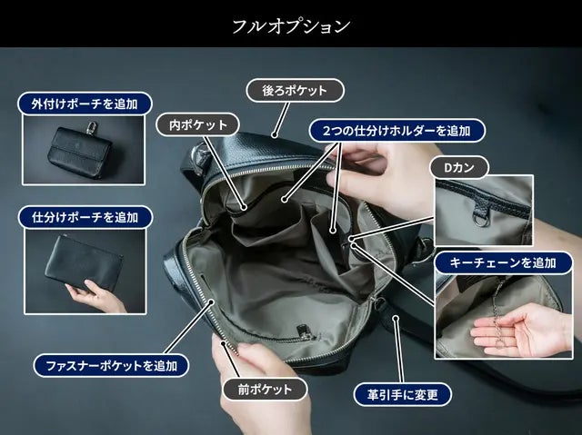 オプションで追加できるポケットで自分仕様のクロスボディバッグに!