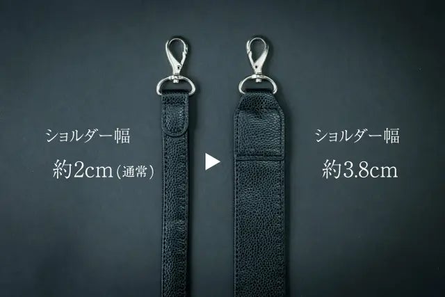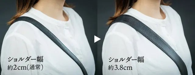 通常20mm幅のショルダーベルトを、38mm幅の太いベルトで製作いたします。
