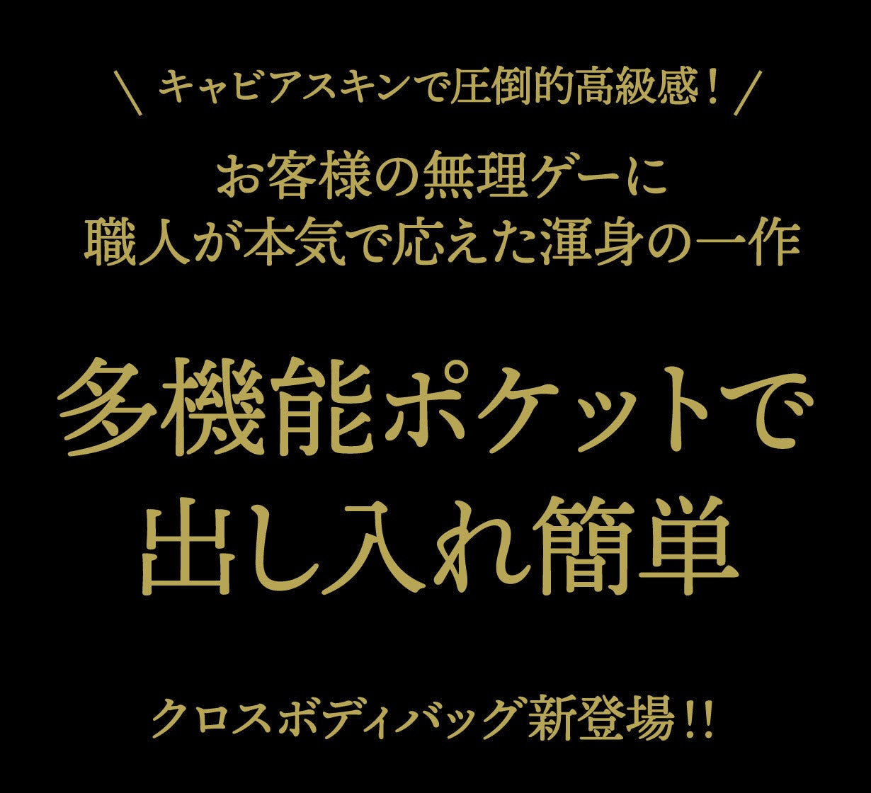 "職人の技術と顧客の声が融合"お客さまの声を職人の技術を通じて反映した作品です。YoutubeやGoogleフォームのアンケートを通じてお客さまの声を聞き、それらを叶えるために職人の技術を活用します。加えて、厳選された革も高級感のあるキャビアスキンにすることにより、美しさを最大限引き出してくれます。使い勝手がよく、洗練されたデザインなので様々なシーンで活躍してくれます。