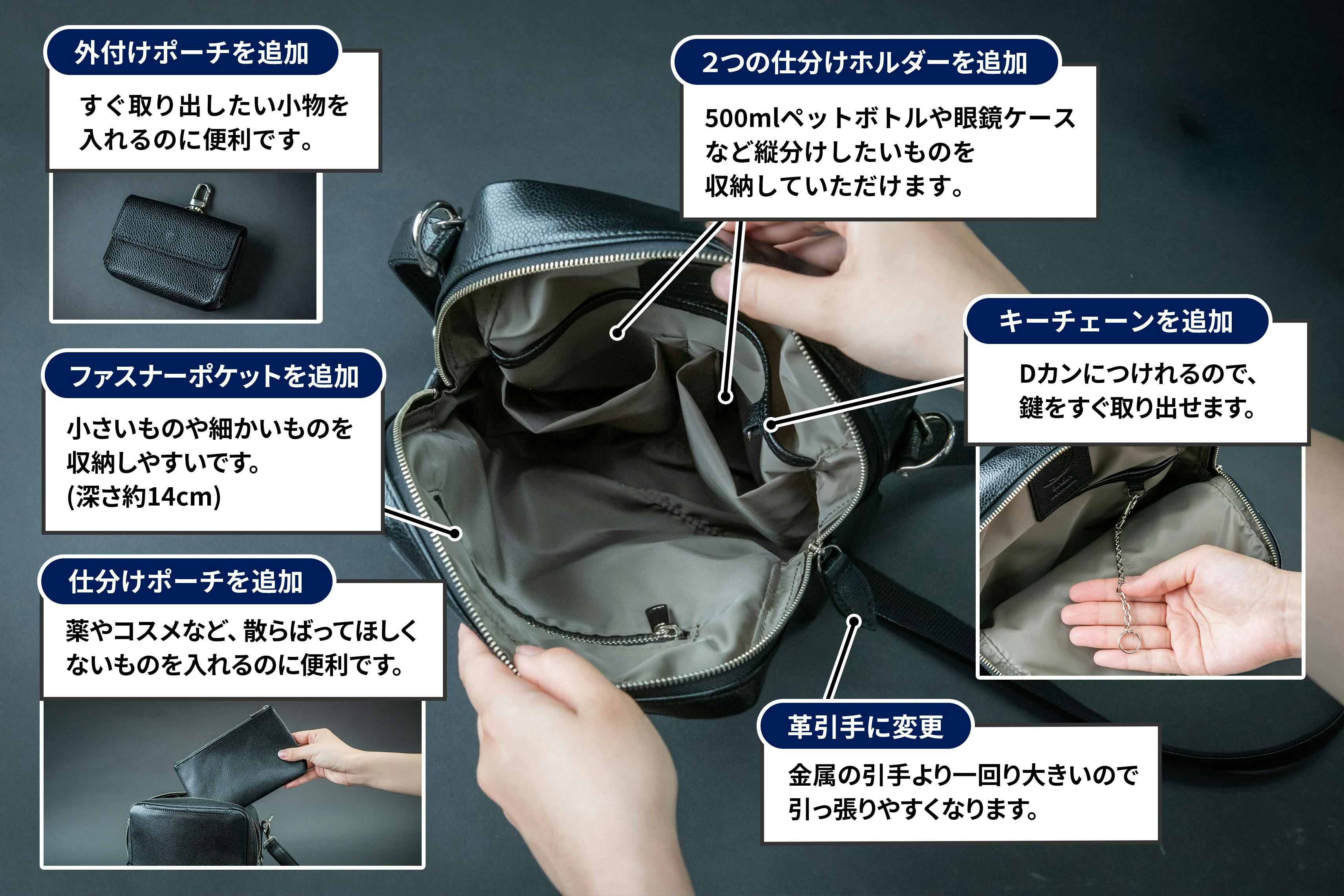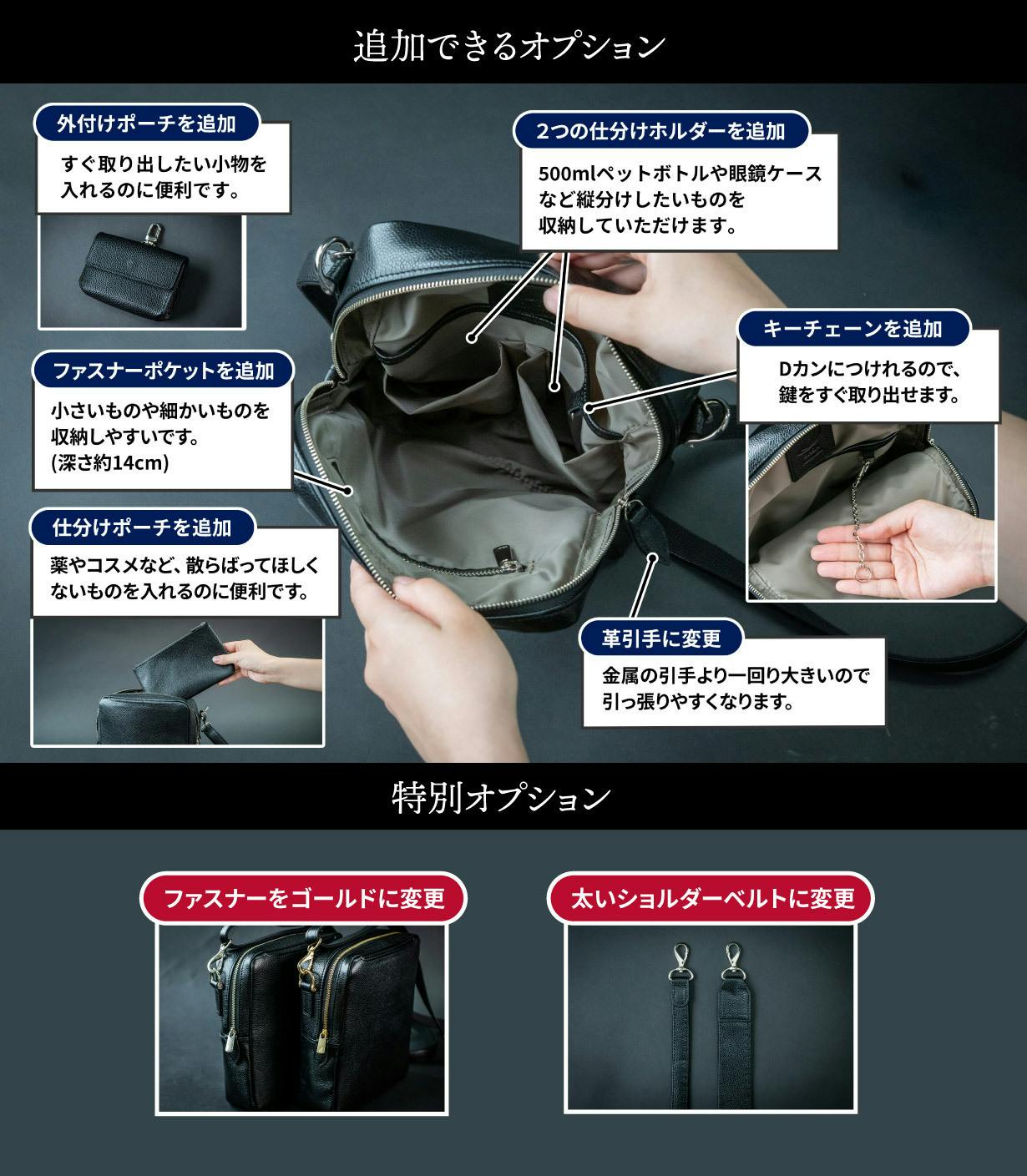 オプションを追加購入いただくことで、自分のライフスタイルに合わせたバッグを作ることができます。
