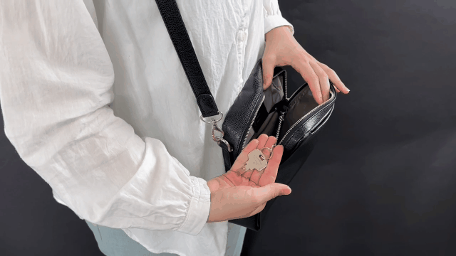 ご覧いただきありがとうございます!スタッフの山田です。大雑把な私はよく「カギどこ~?」と鍵が行方不明になりがち。その為、家の鍵をつけれられるキーチェーンと車の鍵を入れられる外付けポーチはとってもありがたい!また、目薬や鏡などの小物が鞄の中で「どこいった~?」と行方不明にならないようにファスナーポケットをチョイスしました!