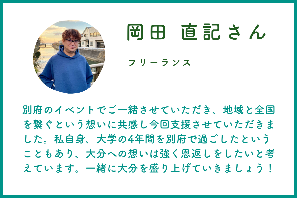 別府のイベントでご一緒させていただき、地域と全国を繋ぐという想いに共感し今回支援させていただきました。私自身、大学の4年間を別府で過ごしたということもあり、大分への想いは強く恩返しをしたいと考えています。一緒に大分を盛り上げていきましょう!
