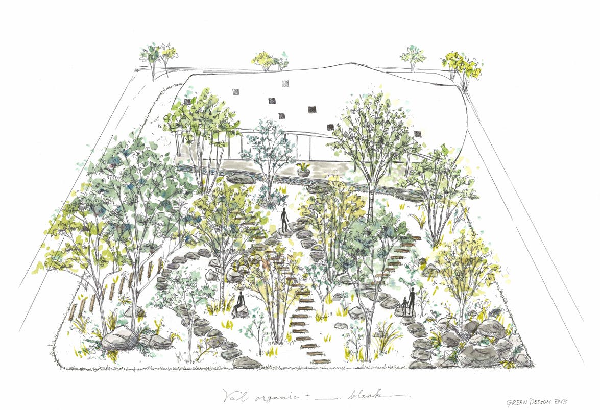 このロケーションを活かすために、店内から眺めても、外に出ても心地よい前庭にすることにこだわりました。.___blankが追求する「余白」の象徴が、この前庭です。