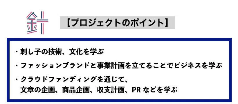 今回のクラウドファンディングは、その第一歩として、高校生たちが実際に刺し子の世界に触れ、将来の担い手となるための経験を提供するものにしたいと考えています。
