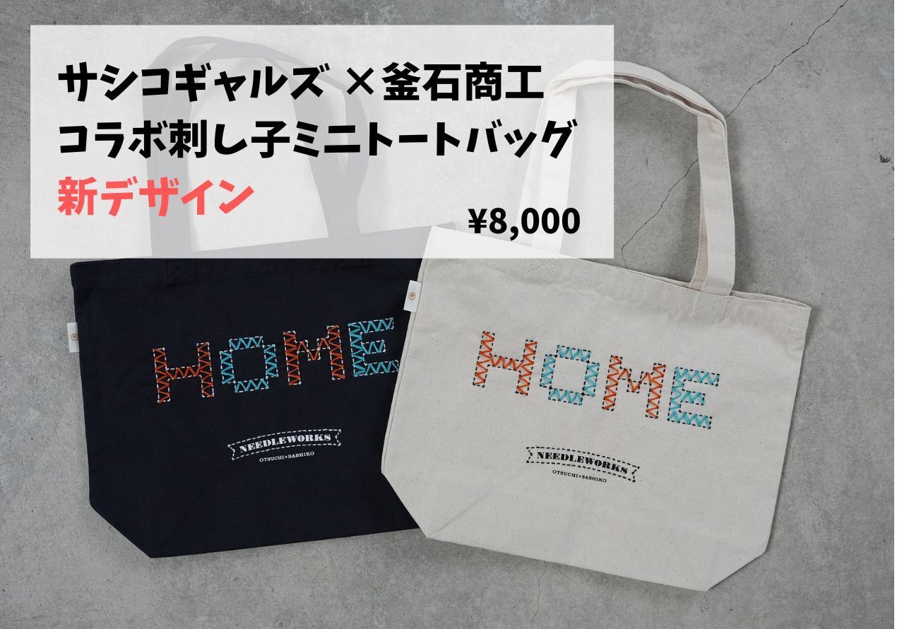 新型トートバッグは"刺し子"のデザインと背面にボロのパッチワークが入っています。