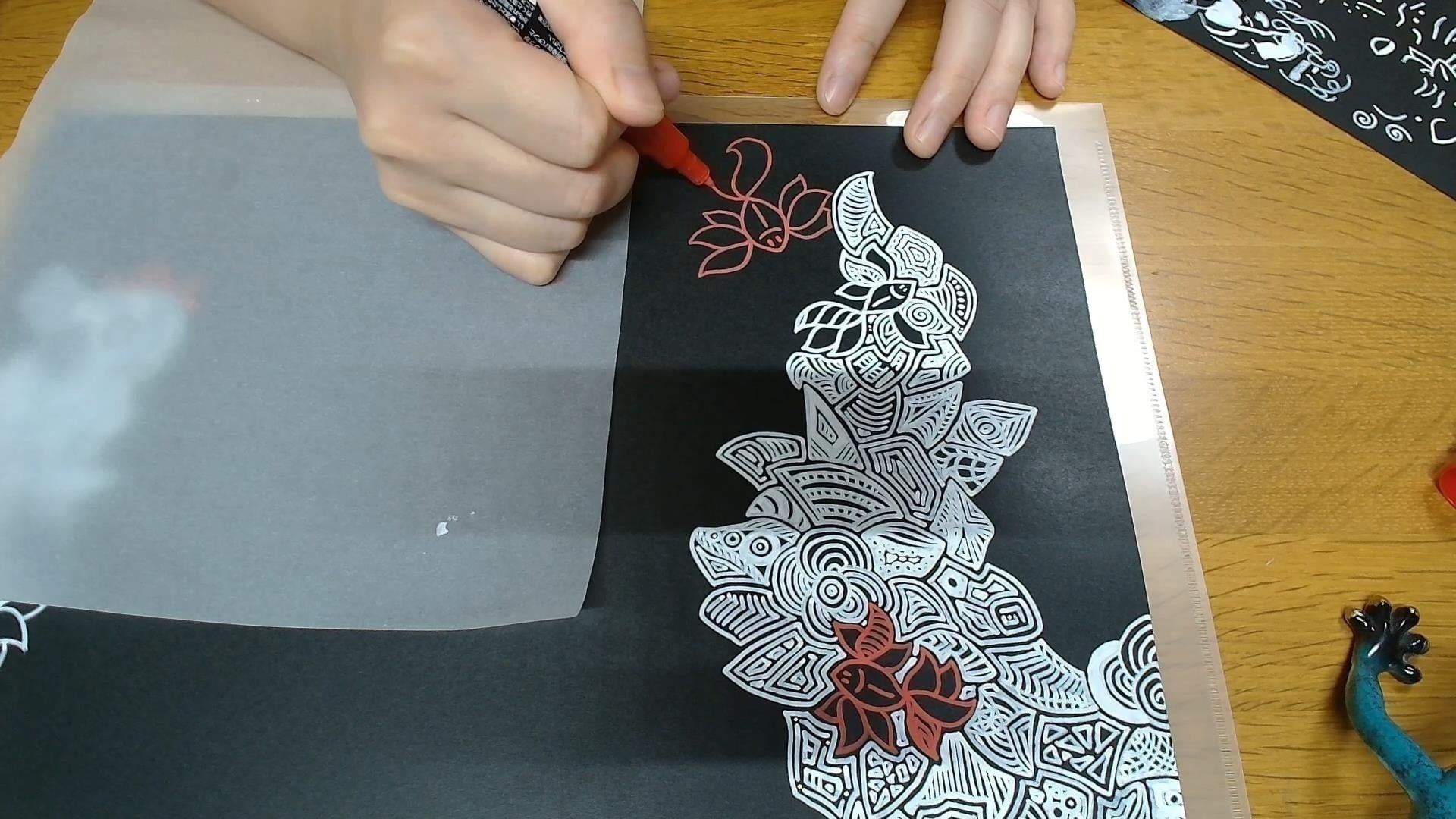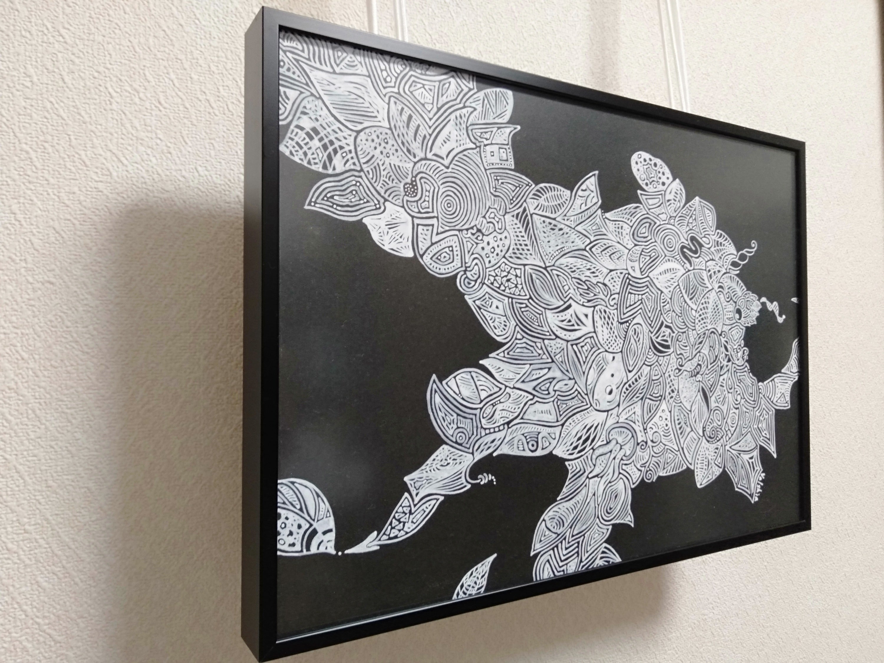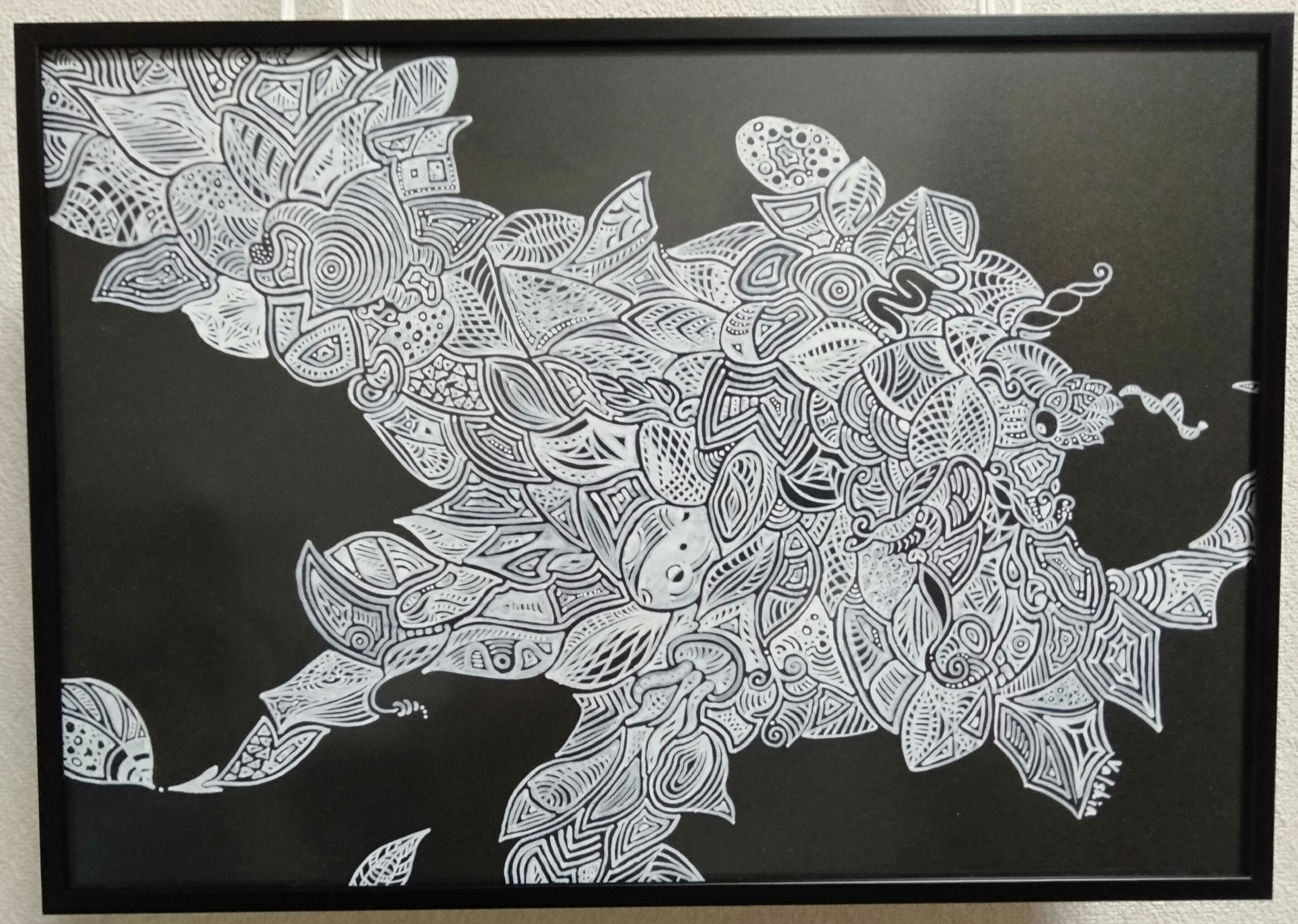 私のペンアートは「見る人によって、見え方が変わる」をコンセプトに、黒紙に白ペン(POSCA)で描いています。
