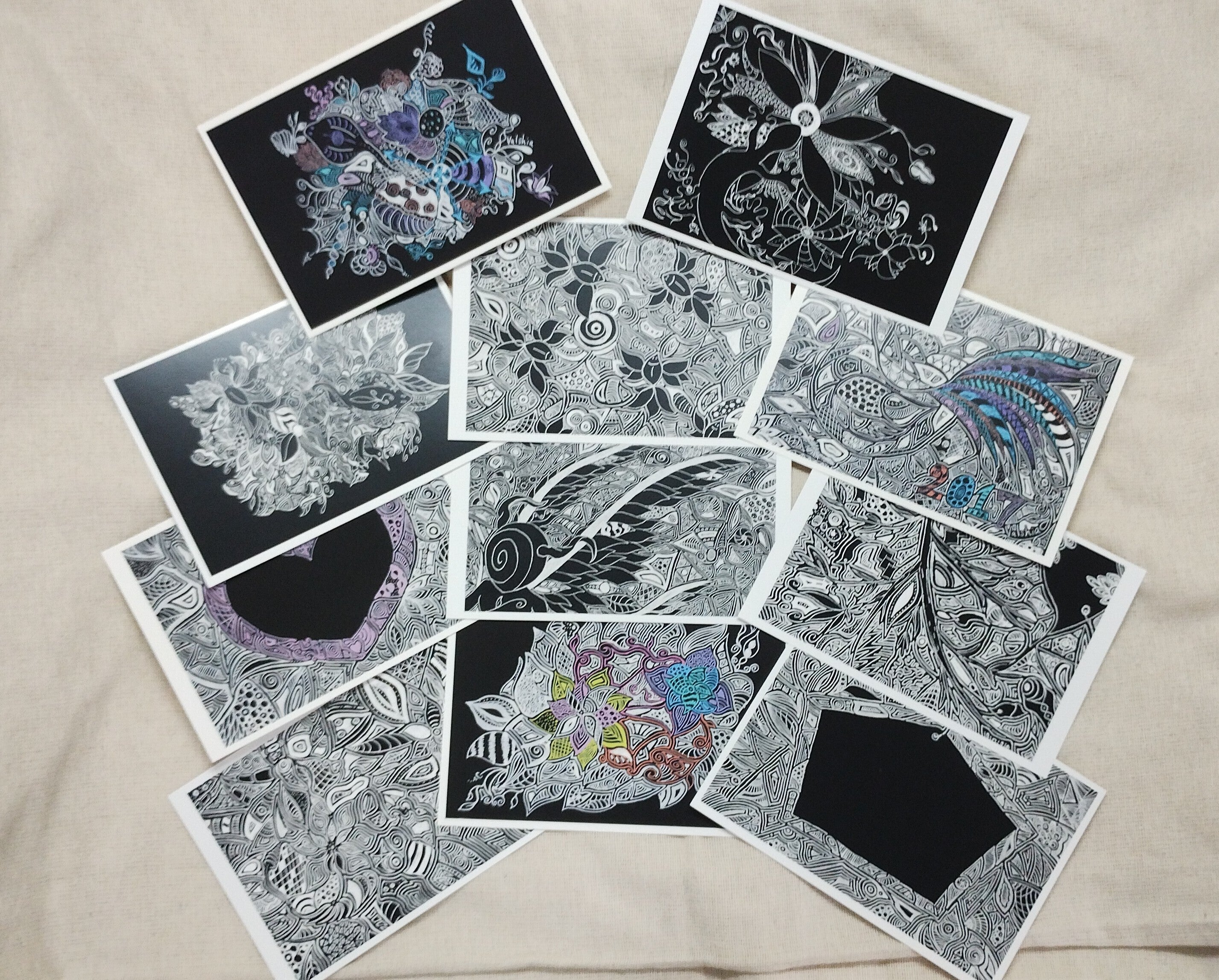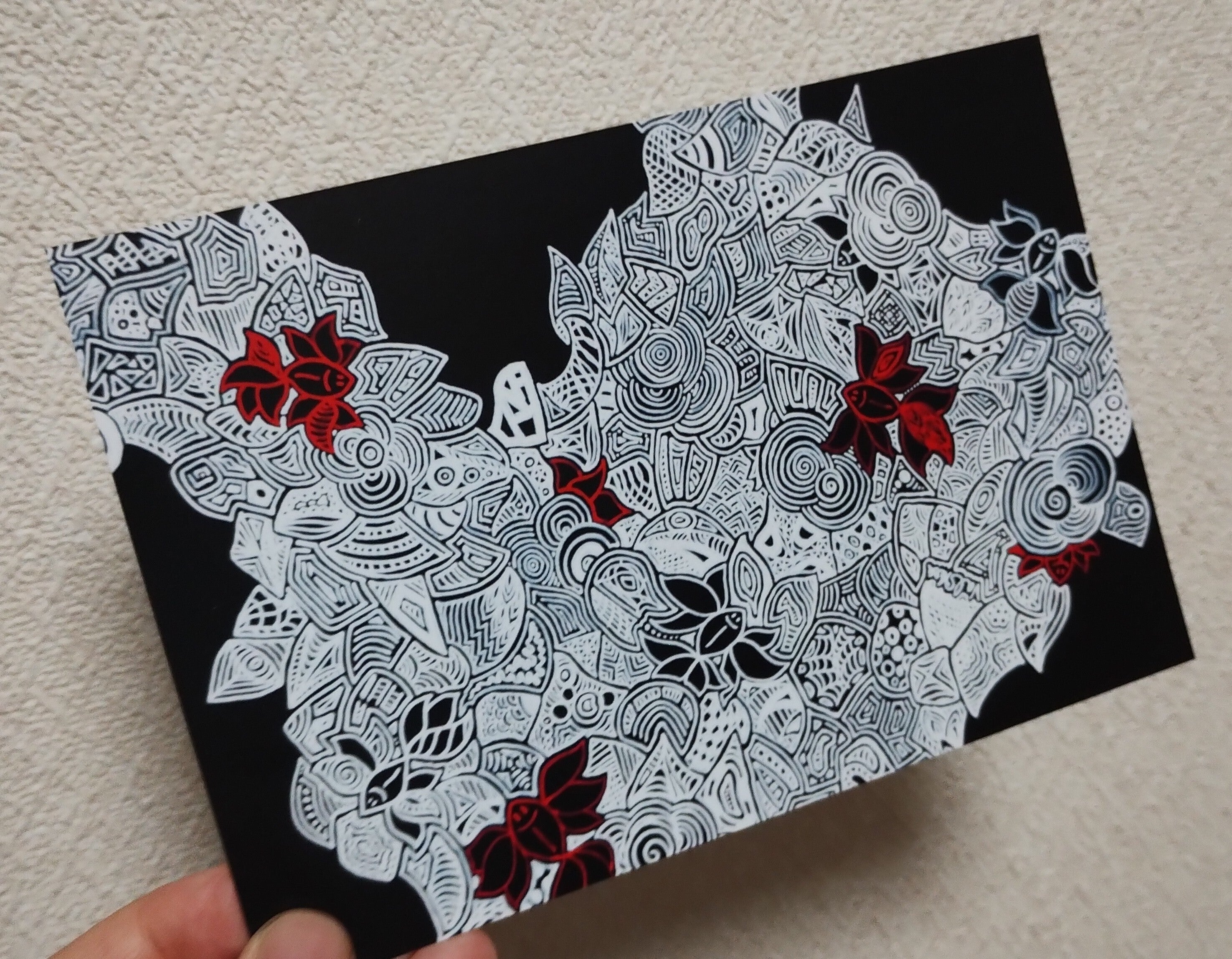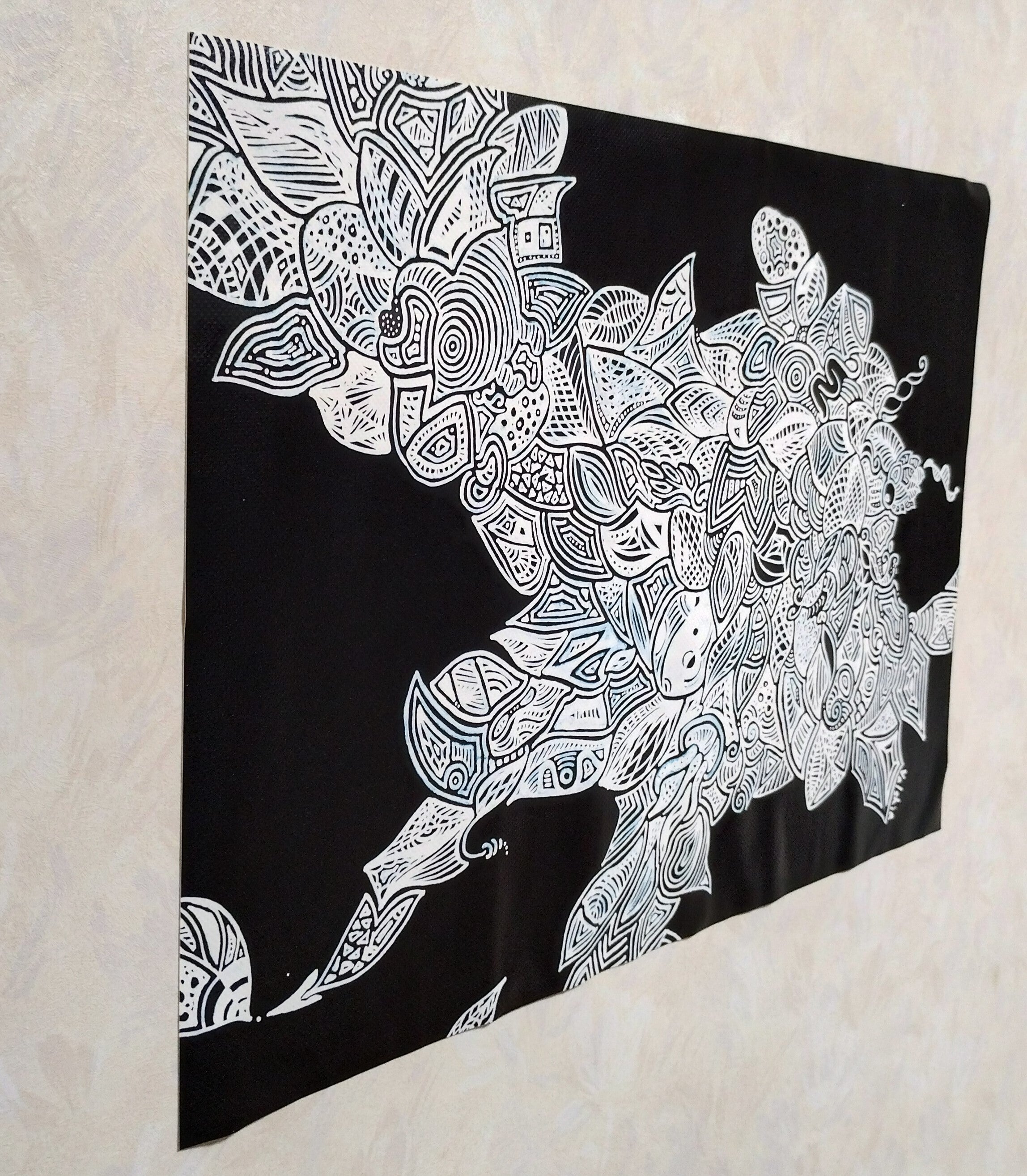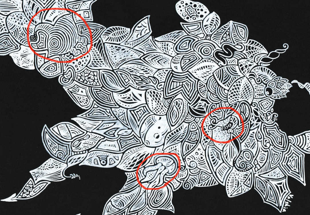 私のペンアートは「見る人によって、見え方が変わる」をコンセプトに、黒紙に白ペン(POSCA)で描いています。