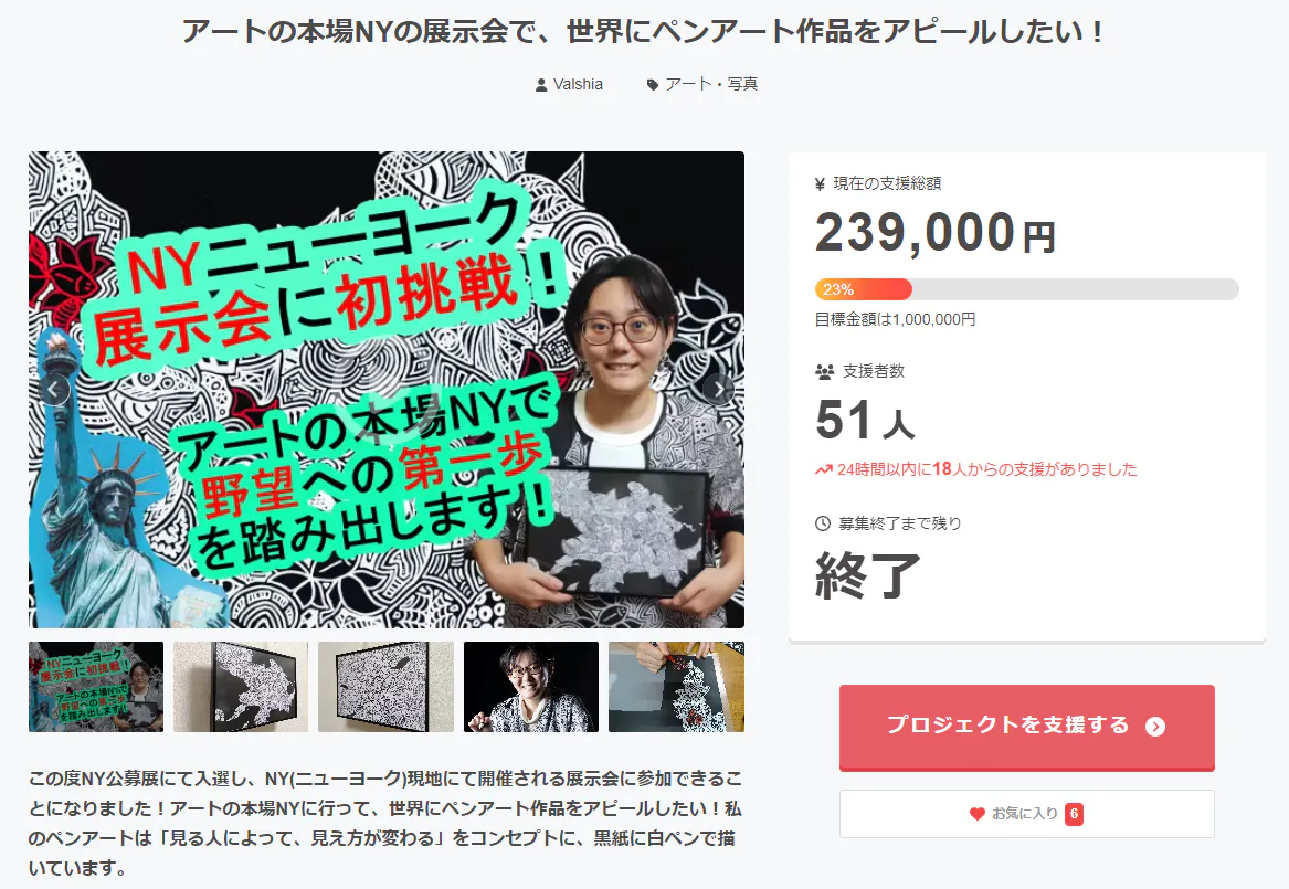 2024/10/26 22:4911/18(金)にValshia初のクラウドファンディング挑戦が終了しました!皆様のご支援や、情報シェア等応援のおかげで11/6(日)から始まったこのプロジェクトは、13日間という2週間もない短い期間にも関わらず、20万を超え最終239,000円となり、支援者数は50名を超え最終51名の方にご支援いただきました!これは大成功ではないでしょうか!? 応援してくださった皆様、本当にありがとうございます!リターンについてはお手元に届くまで、少しお時間いただきますが、楽しみにしていただけたらと思います!このクラウドファンディングを通して、今まで1人で頑張りすぎていたと、そしてたくさん協力してくれる人がいて、人と人との繋がりの大切さを改めて実感しております……!NY行きの準備等々で1週間程遅れての活動報告となりましたが、現地でギャラリー関係者にお渡しするポートフォリオの英語版も作成完了し、着々と準備しております!NYへ出発するまであと約1週間!NYへ行っている間にインスタグラムでライブも計画していますので、ぜひぜひまた見ていただけたらと思います!体調に気を付けて行ってきます!ValshiaのInstagramはこちらです。ライブが見たい方は登録しておいていただければと思います!https://www.instagram.com/valshia_/ もっと見る