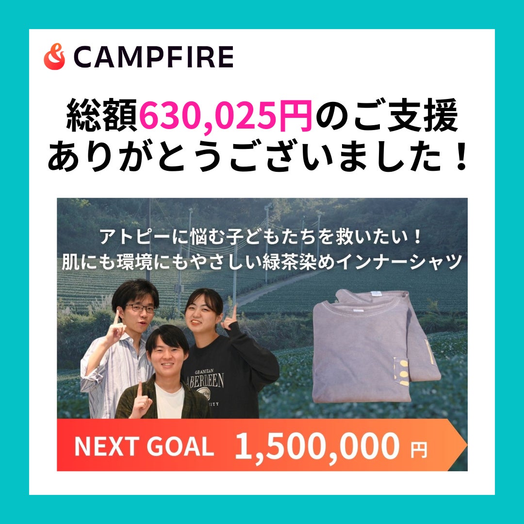2025/02/03 17:25こんにちは。神戸大学起業部SkinNotesの北野です。この度は、私たちのプロジェクト「アトピーに悩む子どもたちを救いたい!肌にも環境にも優しい緑茶染めインナーシャツ」の拡散・支援にご協力いただき、誠にありがとうございました。おかげさまで、91名の皆さまから総額630,025円のご支援を賜り、無事プロジェクトを達成することができました。ひとりひとりの温かい応援、共感の声が、この挑戦を支えてくださいました。心より感謝申し上げます。皆様からの支援金は、以下の用途で使用いたします。・緑茶染めインナーシャツの開発・提供・インナーシャツ以外のアトピー性皮膚炎患者さん向け商品開発・提供・アトピー患者さんのための情報発信基盤作成このプロジェクトは、単なる目標達成にとどまらず、多くの方々の想いが込められた大切な一歩となりました。皆さまのご期待に応えられるよう、これからも誠実に、そして情熱を持って取り組んでまいります。「支援してよかった!」と心から思っていただけるよう、今後も進捗をしっかりご報告し、皆さまと喜びを分かち合える機会を大切にしていきます。改めまして、ご支援・ご声援、本当にありがとうございました。このつながりをこれからも大切にし、「アトピー性皮膚炎患者さんが明るく前向きに生きられる社会」をともに築いていければと思います。今後も各種SNSにおいて私たちの活動を発信してまいりますので、継続的なご支援・ご協力をどうぞよろしくお願いいたします。各種SNSはこちらから!SkinNotes竹内 悠人 北野 まどか 中野 拓実 もっと見る