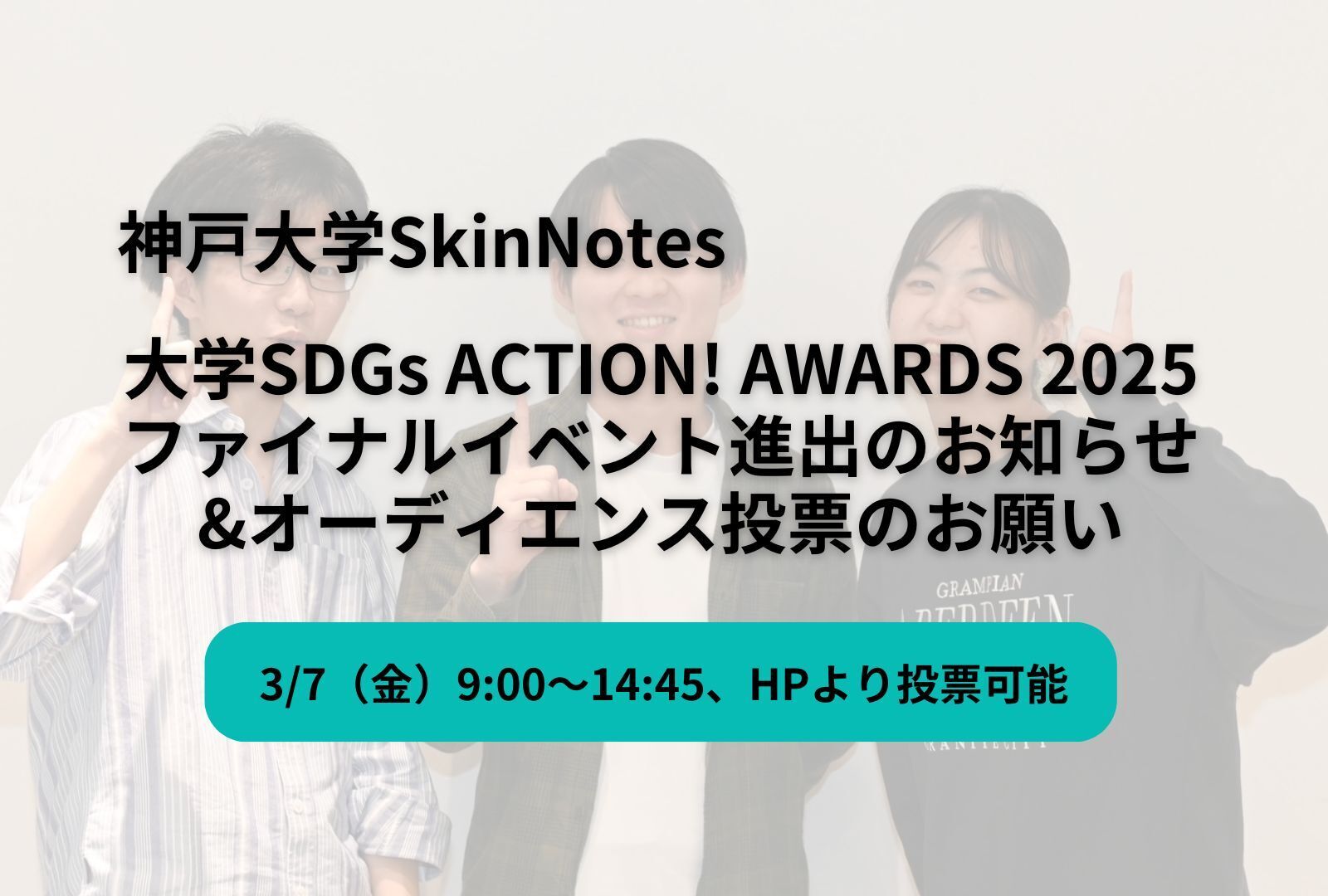2025/03/06 14:00お久しぶりです!SkinNotesの北野です。私たちSkinNotesは、3/7(金)開催の「大学SDGS ACTION! AWARDS2025」ファイナルイベントに出場します。本大会のオーディエンス賞は、皆さんからの投票数で決まります。観覧可否に関わらず、誰でも投票可能です!3/7(金) 9:00-14:45の間に、以下のリンクから投票をよろしくお願いいたします!https://www.asahi.com/sdgs/article/15640720 もっと見る