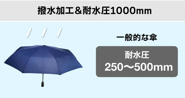 又、耐水圧1000mmの生地を採用。一般的な傘の生地の耐水圧は250mmから500mm程度とされています。