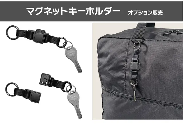 ドイツのパーツメーカーFIDLOCKのマグネットバックルを採用。バックルは一度付けばしっかりホールド。外す際はスライドするだけの便利な設計。Oリングはワンタッチで鍵を通しやすく、リュックのハーネスループやパンツのベルトループにも簡単に付けられるので便利。