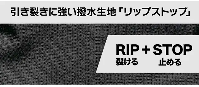 軽量でありながら非常に強度があります。格子状に繊維が縫い込まれているため、リップストップという名前の通り破れたりほつれたりしにくく耐久性が高いのが特徴です。また、撥水性にも優れています。