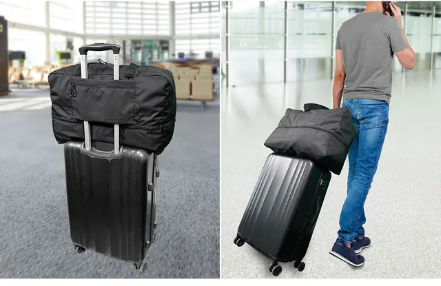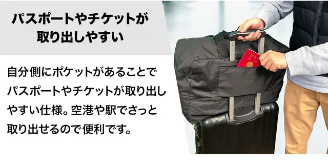 スーツケースにセットして固定できるキャリーオン機能を搭載。ポケット部分をハンドルに通してバッグを固定できます。荷物をまとめて移動できるので便利です。