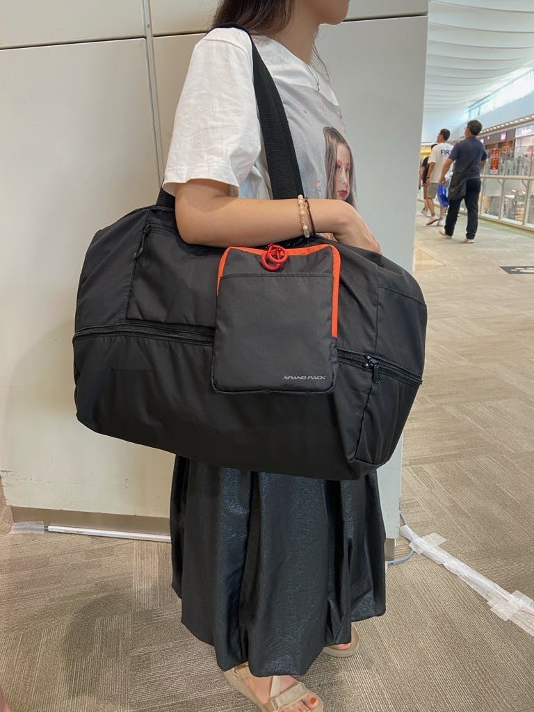 モデルは身長158Cmの方です。拡張していない状態で、荷物はできるだけ詰め込み膨らませるようにしました。