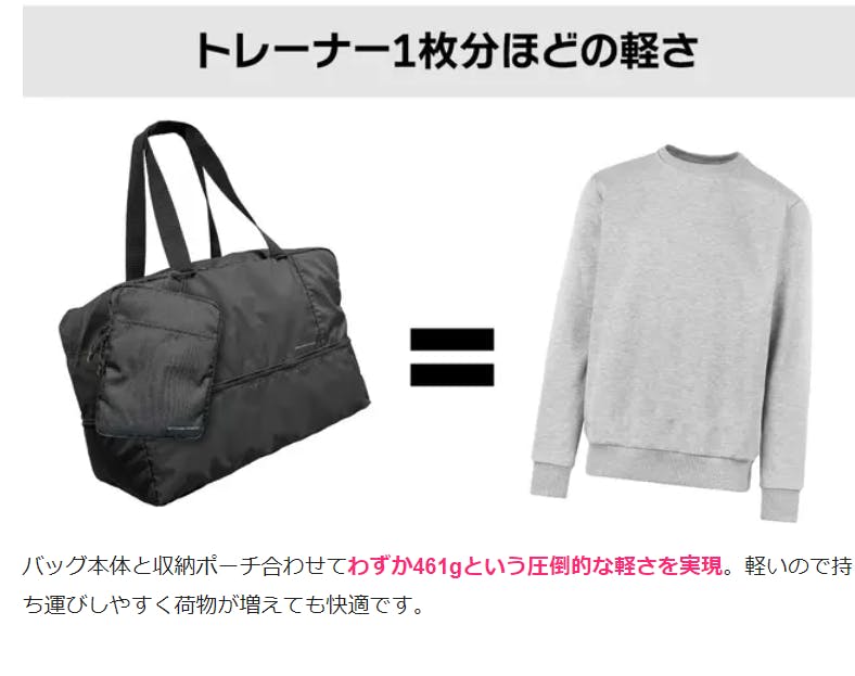 折畳みサイズは収納ポーチの高さ21.5×幅16cmに入るサイズになりっております。ポーチ自体の厚みは2cmになりますが、折り畳んだ際に膨らみが出ますので中央部分が約3~4cmになります。少し厚みのあるポーチをイメージして頂ければと思います。重さはトレーナー1枚分くらいです。最大60lになりますが、スーツケースの中に入れても邪魔にならない大容量バッグとなっております。