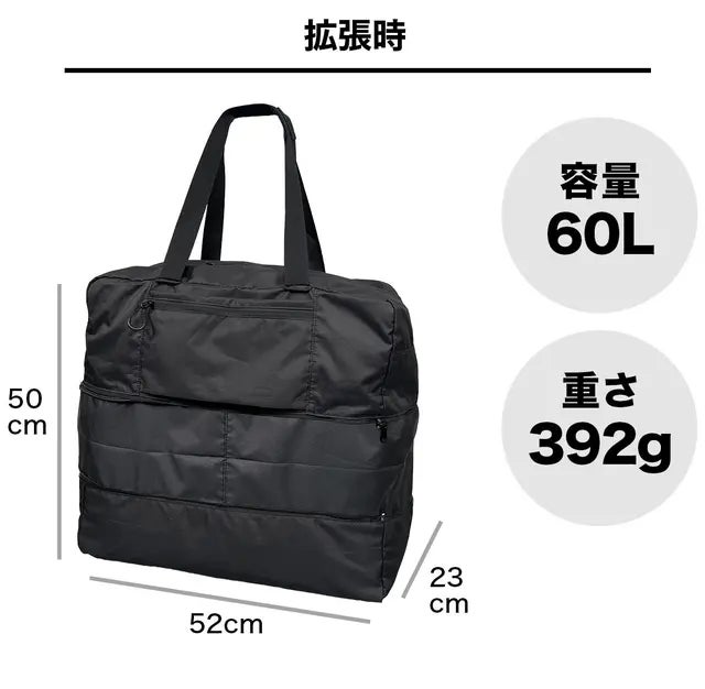 いつもの買い物や旅行先でのお土産などたくさんの荷物をしっかり収納。大容量なのでキャンプ用品やジムの着替え・シューズなど何でも対応できます。